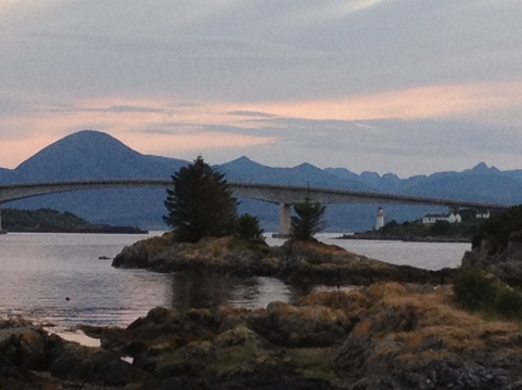 Blick auf die Brücke nach Skye in der Abenddämmerung. Eine Fähre fährt hier schon lange nicht mehr – irgendwie schade.