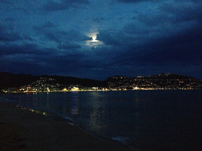 Abendstimmung an der Costa Brava. So langsam senkt sich die Nacht über Rosés. Und der Mond lugt durch die Wolken.