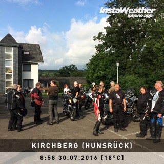 Auf Nebenwegen ging es Richtung Idar-Oberstein. Im Berghotel Kristall hatten wir uns zur Kaffeepause angesagt. Mit vier Gruppen waren wir unterwegs, die sich unterwegs immer wieder mal trafen und – um nicht hintereinander her fahren zu müssen – spontan den einen oder anderen Umweg einlegten. Am Ende saßen wir alle auf der Sonnenterrasse vereint – fast alle …
