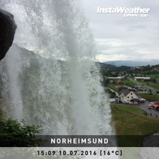 Bald darauf ludt der Steinsdalsfossen zu einem Fotostopp nebst Kaffeepause. Der mächtige Wasserfall stürzt sich tosend in die Tiefe und nimmt dabei so viel Schwung, dass man hinter der „Wasserwand“ her laufen kann. Ein beeindruckendes Bild.