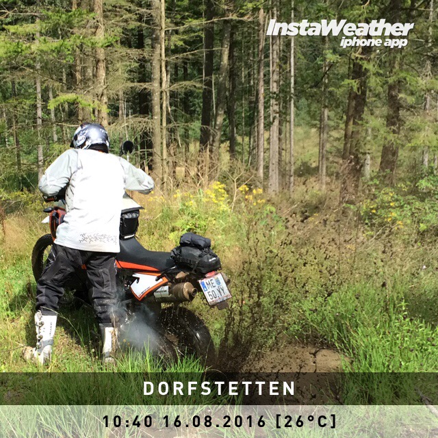 Einer davon scheint mitten im Wald zu enden. Doch weit gefehlt. Ortskundig wie Andi ist, hält er mitten auf ein morastiges Loch am Wegesrand zu und versenkt die 990er KTM erstmal im feuchten Untergrund. Schuld sind die falschen Reifen. Zu wenig Klötzchen 😉