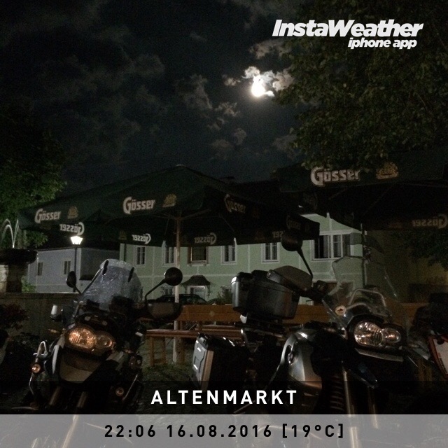 Das Abendessen wir wieder einmal spitzenmäßig, so dass wir satt und zufrieden den „Absacker“ draußen in der Laube trinken und dabei den Vollmond genießen konnten. Der tauchte unsere Motorräder in ganz milchiges Licht. Auch das ein besonderes Erlebnis der diesjährigen Waldviertel-Tour.