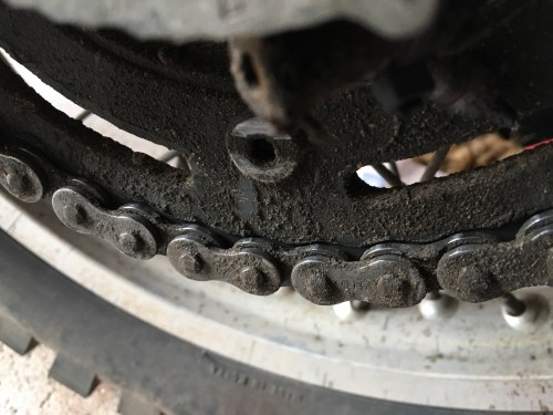 Wenn ich mir jetzt aber das Kettenblatt anschaue, scheint doch Handlungsbedarf geboten. Rund um die Zahnräder klebt noch der Knaster der jüngsten Endurowanderung durch Belgien. Da sind wir zwei Tage lang auf völlig durchweichten Feldwegen unterwegs gewesen. Das hat – trotz anschließend gründlicher Reinigung – offensichtlich Spuren hinterlassen.