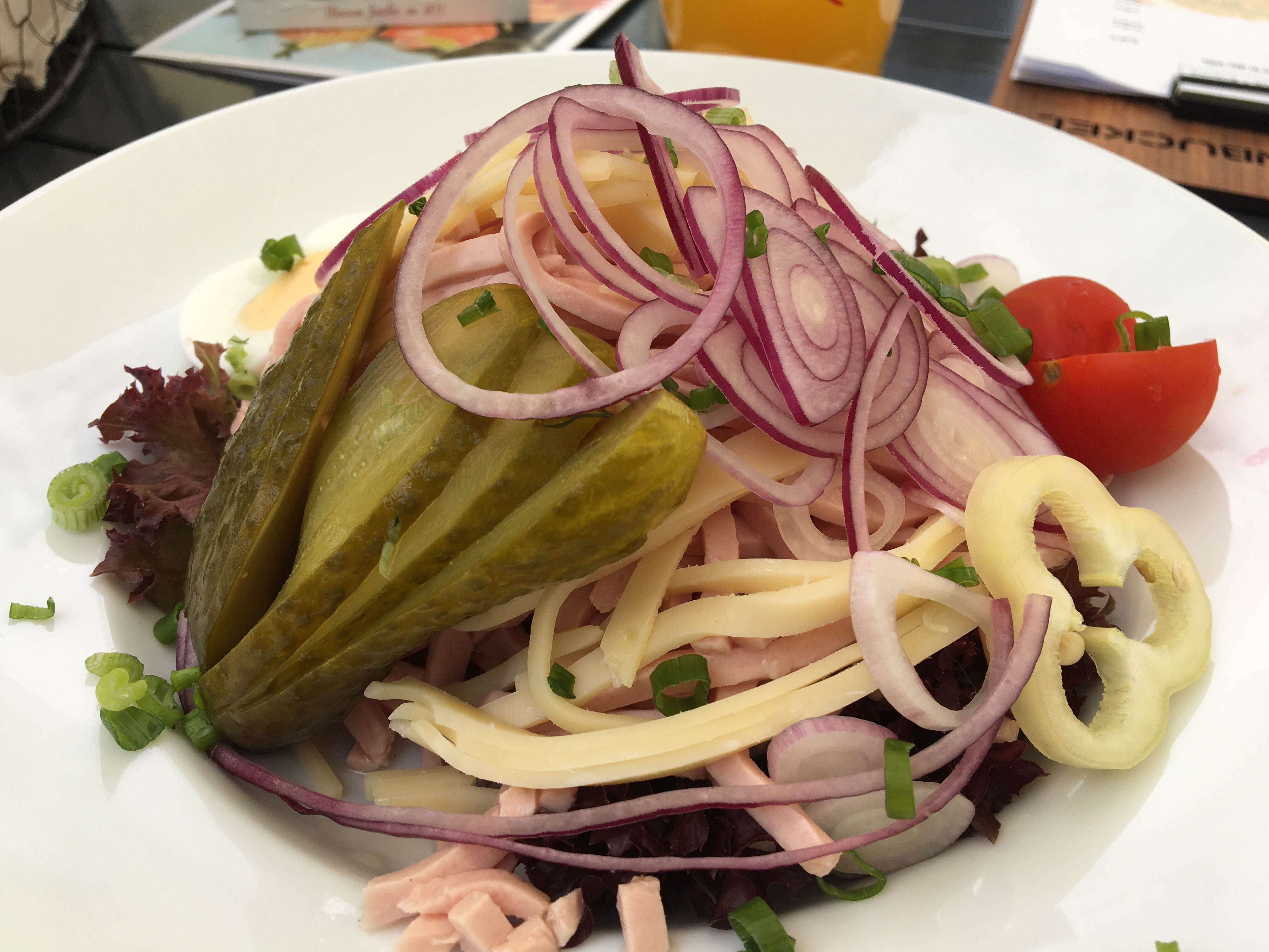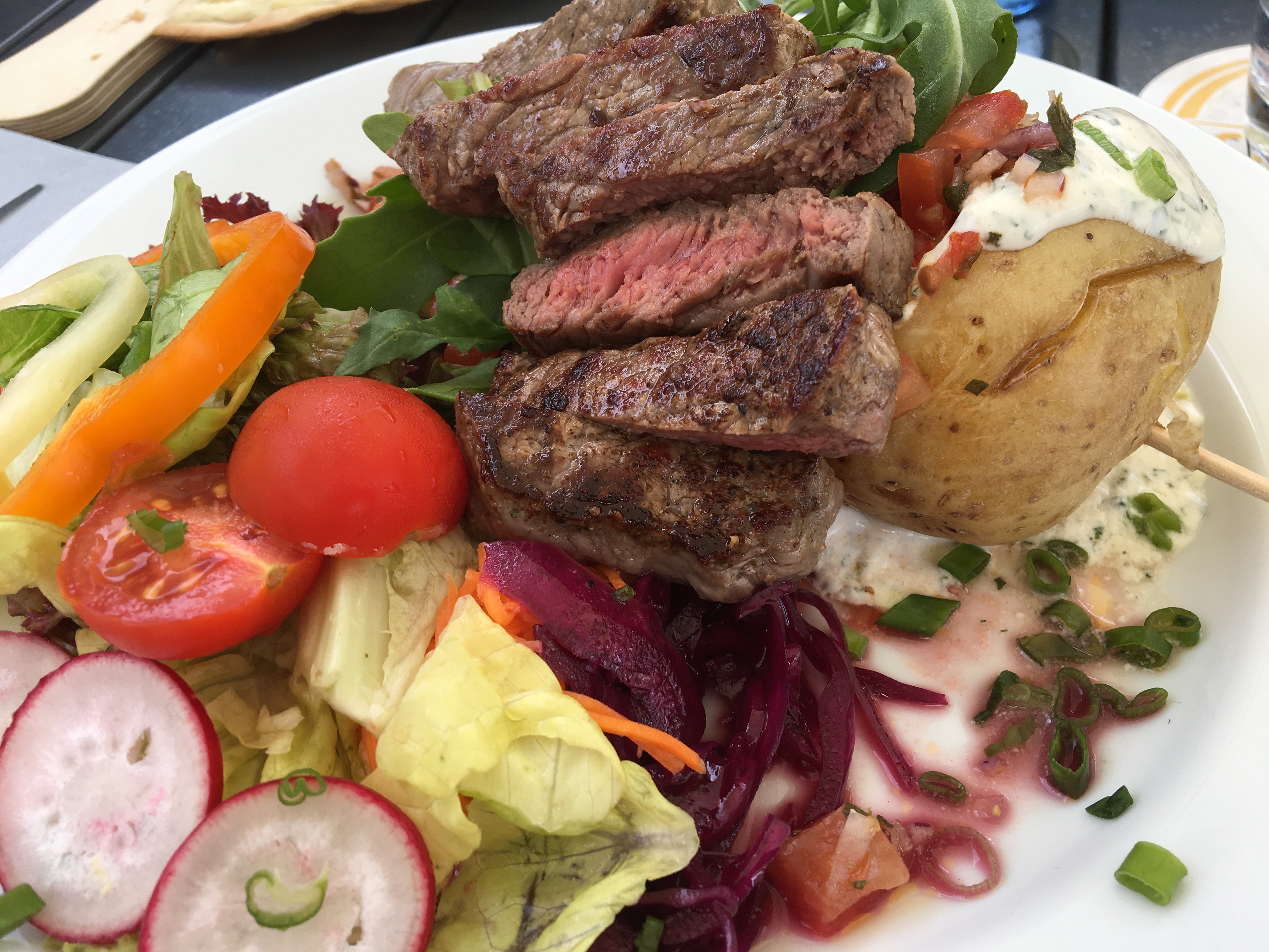 Das Gasthaus heißt jetzt „Villa Katzenbuckel“ und hat seinen Charakter mit dem Eigentümerwechsel etwas verändert. Früher ein typisches Wanderlokal mit guter Küche setzt man jetzt mehr auf Events. Das Essen ist aber immer noch toll und so stillen wir erst einmal unseren Hunger. Ein deftiger Wurstsalat, eine herzhafte Quiche Lorraine, eine große Ofenkartoffel mir Sourcream, Salatbouquet und Rumpsteakstreifen oder ein schönes Schnitzel sind genau das, was unseren Geschmack trifft.