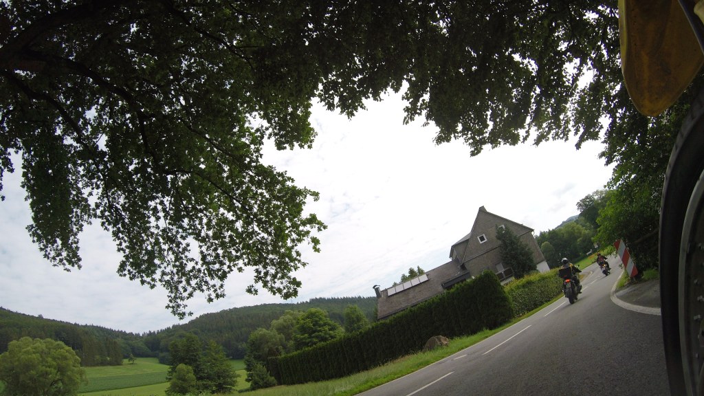 Nur wenig später erklimmen wir den ersten Höhenzug. Dichte Nebelschwaden ziehen wabernd über die Straße und verleihen der Szenerie etwas mystisches. Kaum sind wir wieder im Tal, reicht der Blick weit über die umliegenden Felder. Wie lassen es langsam angehen und schwingen gemütlich von einer Kurve in die nächste, immer mit dem Blick zum Himmel, ob sich nicht doch irgendwo ein Loch auftut, um die Sonne scheinen zu lassen.