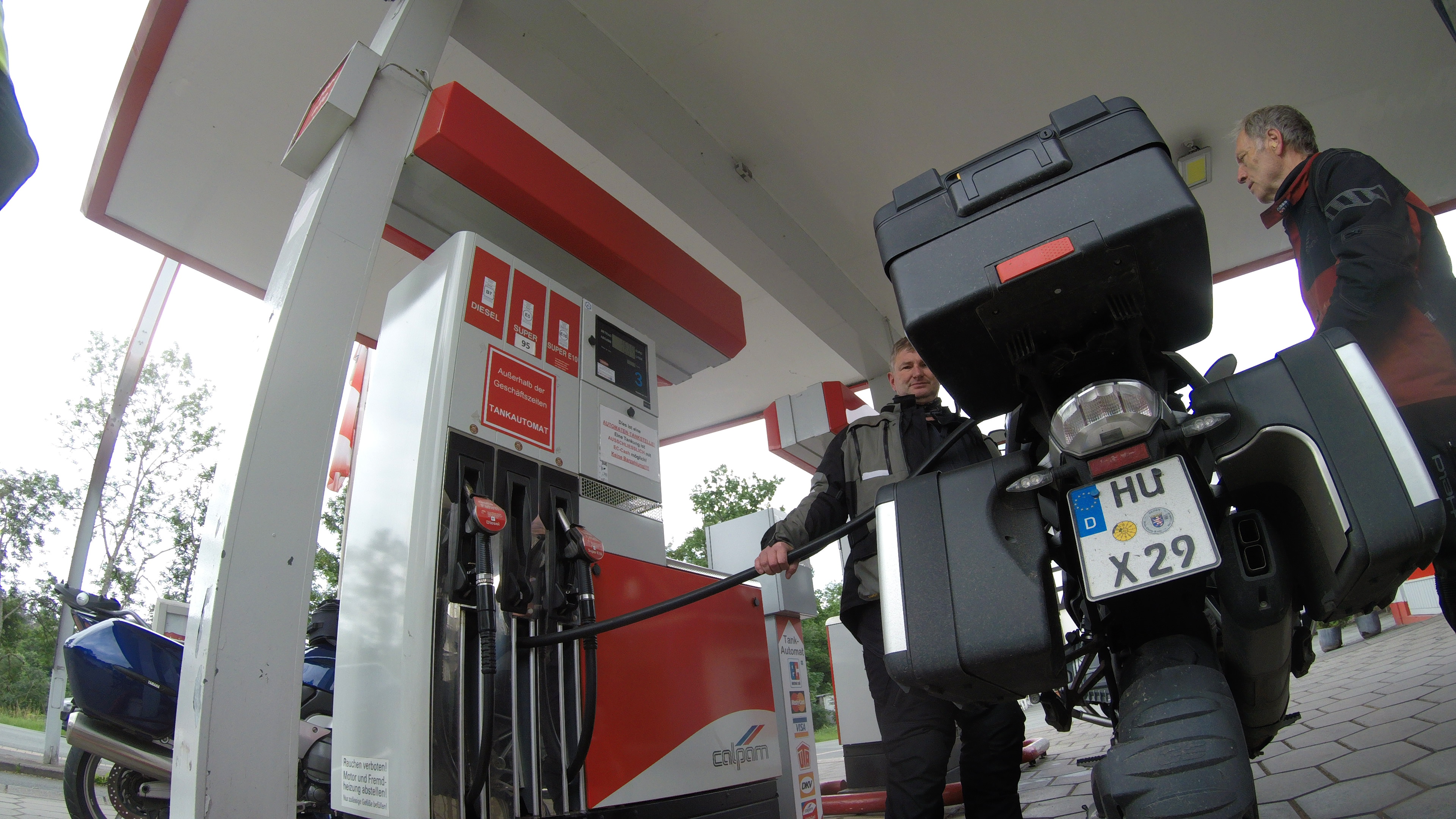 Wir treten den Rückweg an, queren die Eder, die sich linker Hand zu dem gewaltigen See aufstaut und eiern auf den nächsten Kilometern kurvenreich bergan erst einmal einer Harley-Gruppe hinterher. In wilden Bögen geht es nach Lichtenfeld, Frankenberg, Dreislar und vorbei an Hallenberg nach Liesen. Unterwegs legen wir noch einen Tankstopp ein, macht sich bei dem einen oder anderen schon ein wenig Nervosität breit …