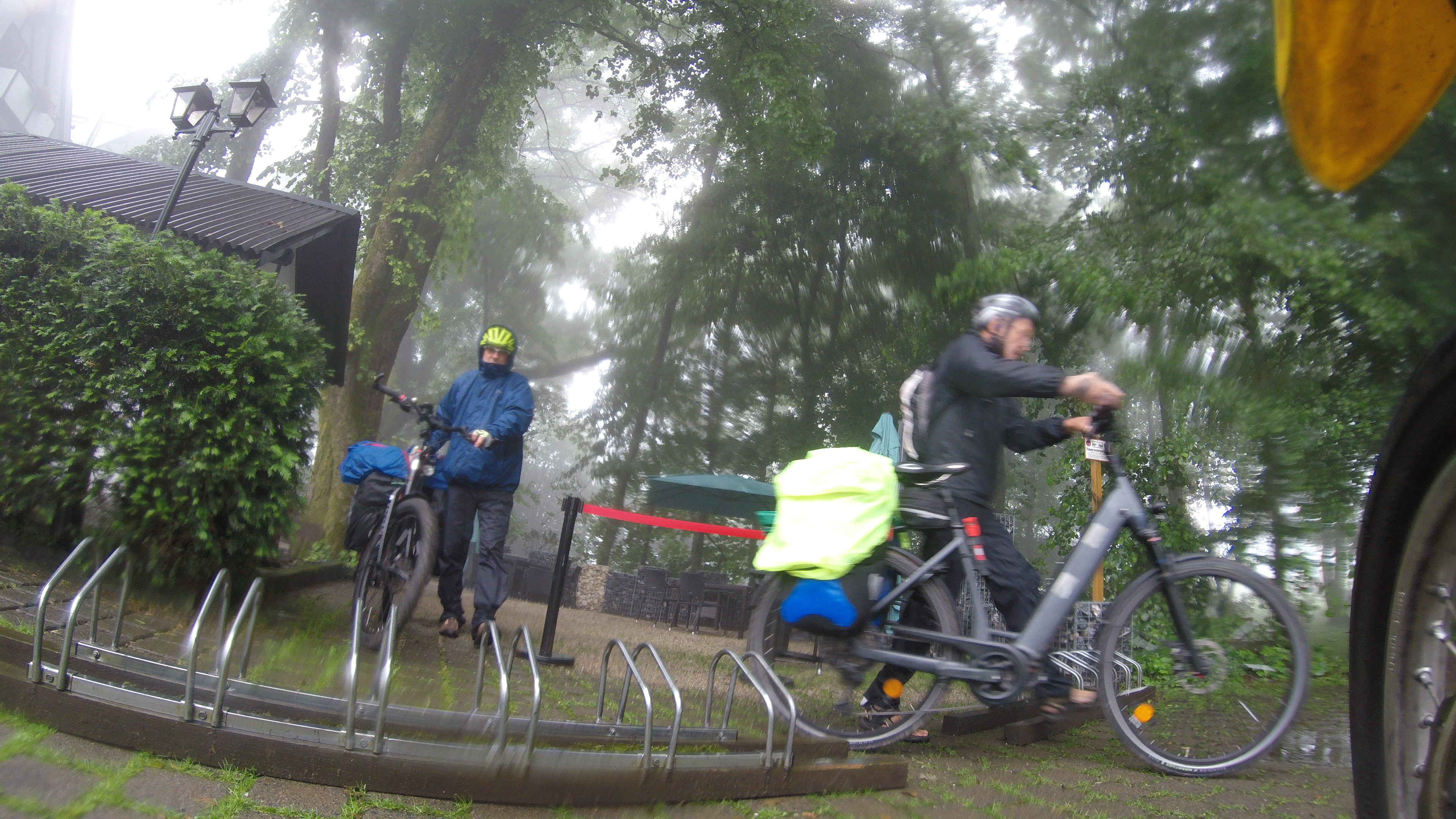 Zwei ältere Herren schieben ihre schwer bepackten Fahrräder vom Gasthof Lahnquelle auf die Straße. Sie zeigen sich vom Wetter ähnlich unbeeindruckt wie wir. 100 Kilometer wollen sie heute fahren. Trotz Elektroantrieb eine stolze Leistung.