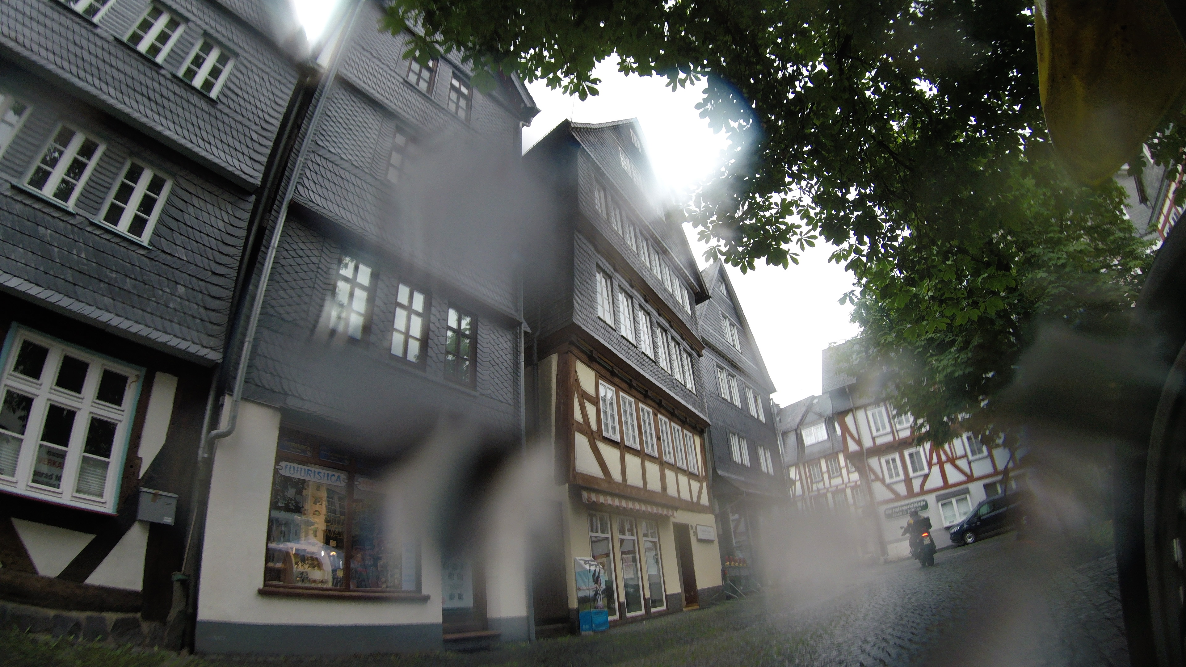 Vorbei an Dillenburg fahren wir nach Herborn, rumpeln dort durch die Altstadt und umfahren die nächste Großbaustelle bei Braunfels elegant auf Nebenwegen – dem Pfadfindergeist von Stefan sei Dank. So langsam klart der Himmel auf, auf den letzten Kilometern sind die Straßen wieder trocken.