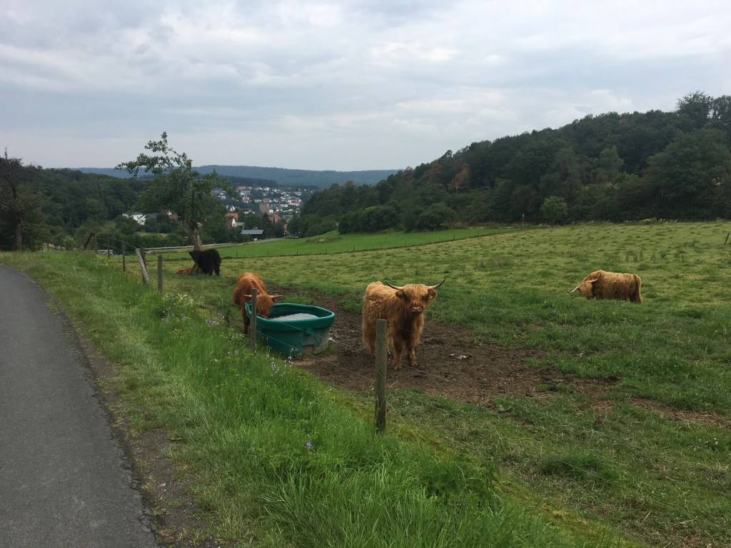 Bis zum Gasthof Röhrig nahe Schmallenberg wäre es nun nicht weit, wenn wir den direkten Weg nehmen würden. Das tun wir in der Regel und auch heute nicht, warten doch Richtung Bad Laasphe viele herrlich kleine, kurvenreiche Straßen darauf, von uns entdeckt zu werden. Und so manches Abenteuer: etwa eine frei laufende Herde von Kühen …
