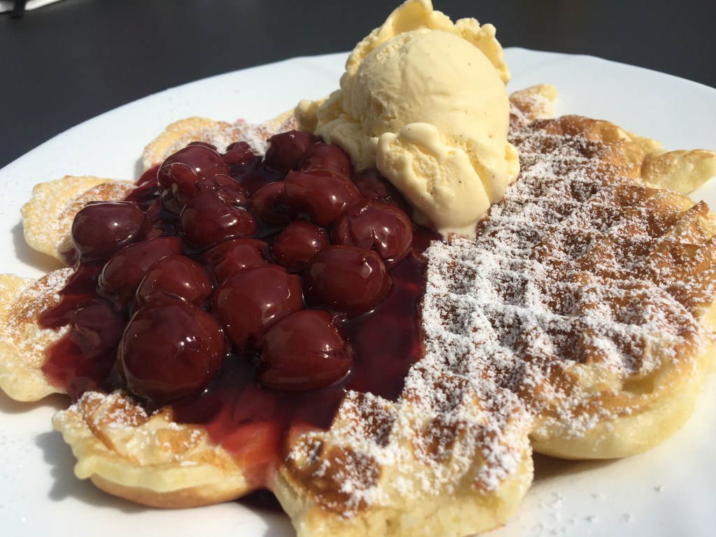 Die nachmittägliche Kaffeepause legen wir im Landgasthof Laibach ein. Vom Parkplatz aus bietet sich ein toller Blick auf die Höhenzüge des Sauerlands. Ich gönne mir eine frisch gebackene Waffel mit Vanilleeis und heißen Kirschen, während wir bei strahlendem Sonnenschein auf der Terrasse sitzen.