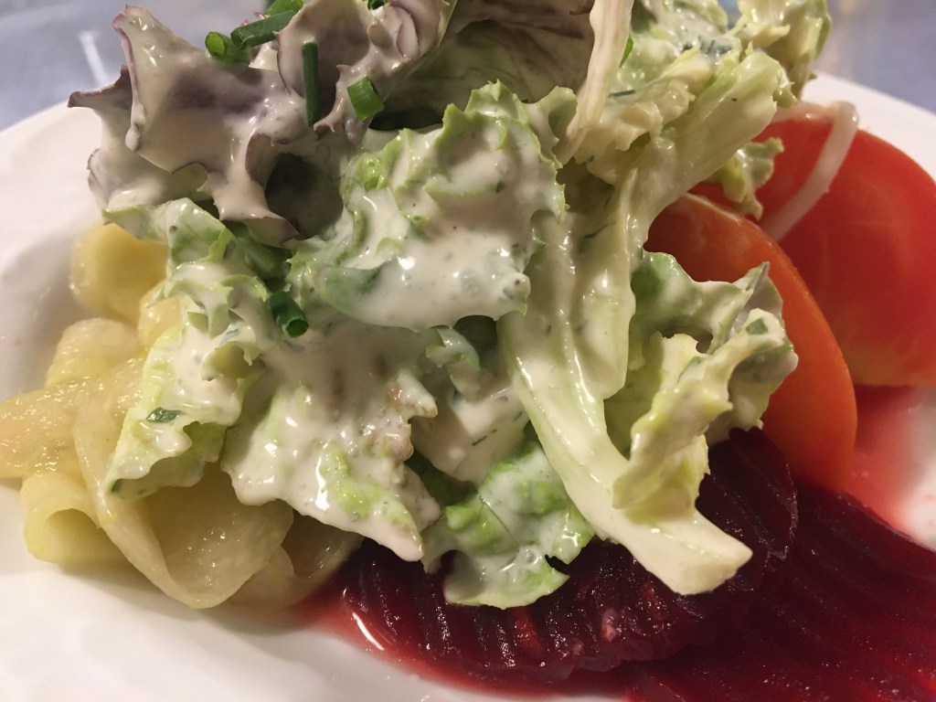 Hans, der sich ein wenig verspätet hatte, kam gleichwohl in den Genuss des „vollen Programms“. Für ihn tischte die Küche noch einmal auf, was die Teller hergaben …