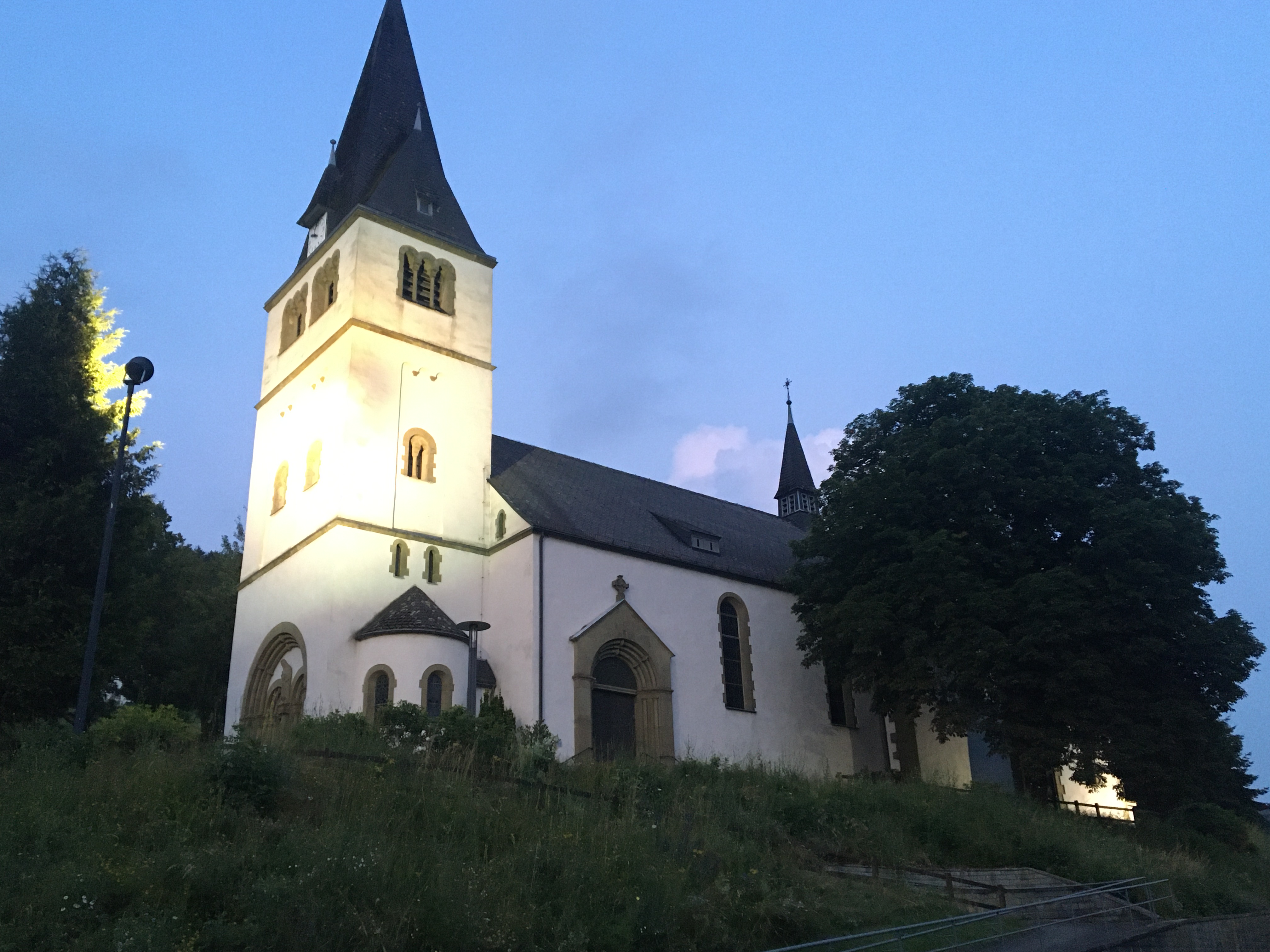 Welch glücklicher Zufall, dass ich mich ausquartieren musste, weil im Gasthof Röhrig nicht mehr genügend Zimmer für unsere Gruppe frei waren. So komme ich zwangsläufig in den Genuss eines willkommenen kleinen Abendspaziergang, der vorbei an der von Flutlicht angestrahlten Kirche St. Antonius zum Gasthof Hubertus führt.