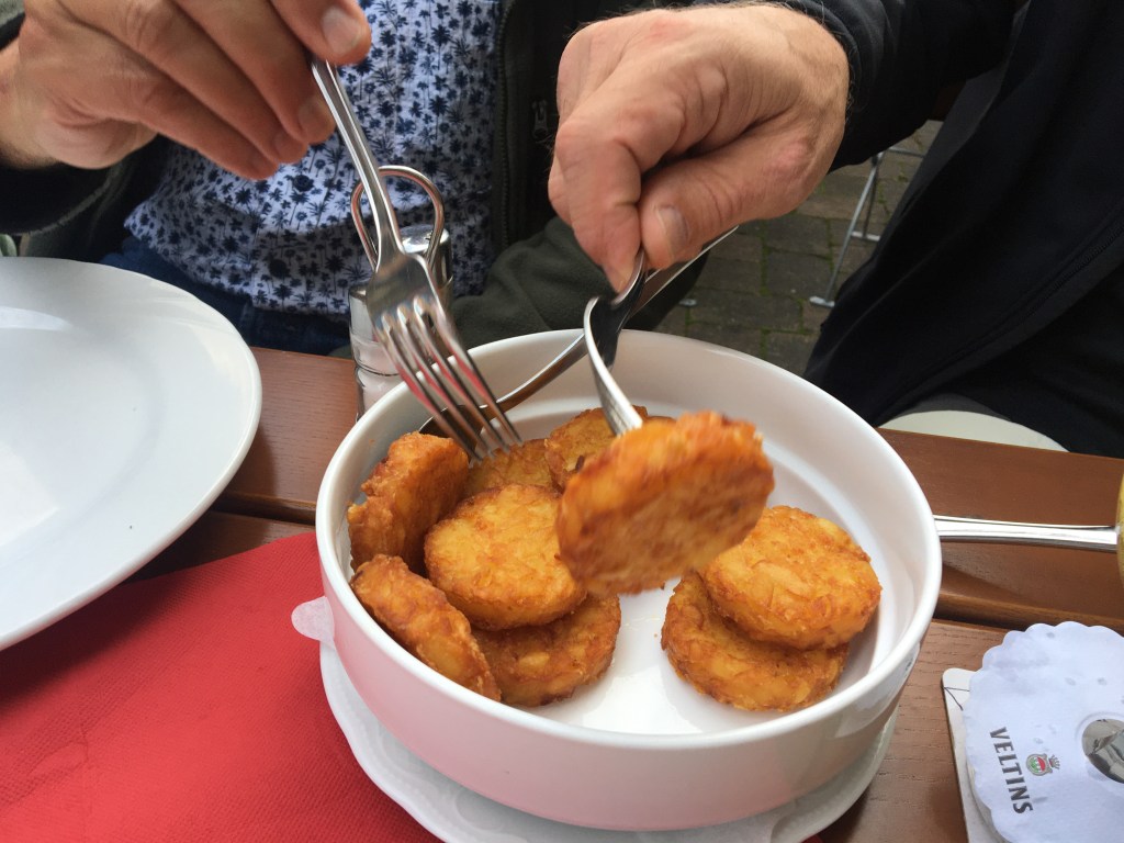 Als wir im Rolandseck in die Speisekarte schauen, ist das Gelächter groß. Wie bei unserem Start am Freitag wird eine Vielzahl an Schnitzelvariationen angeboten – und Hackbraten. Diesmal entscheidet sich Franz-Josef für den „falschen Hasen“; wieder wird ein richtiger Klopper serviert.