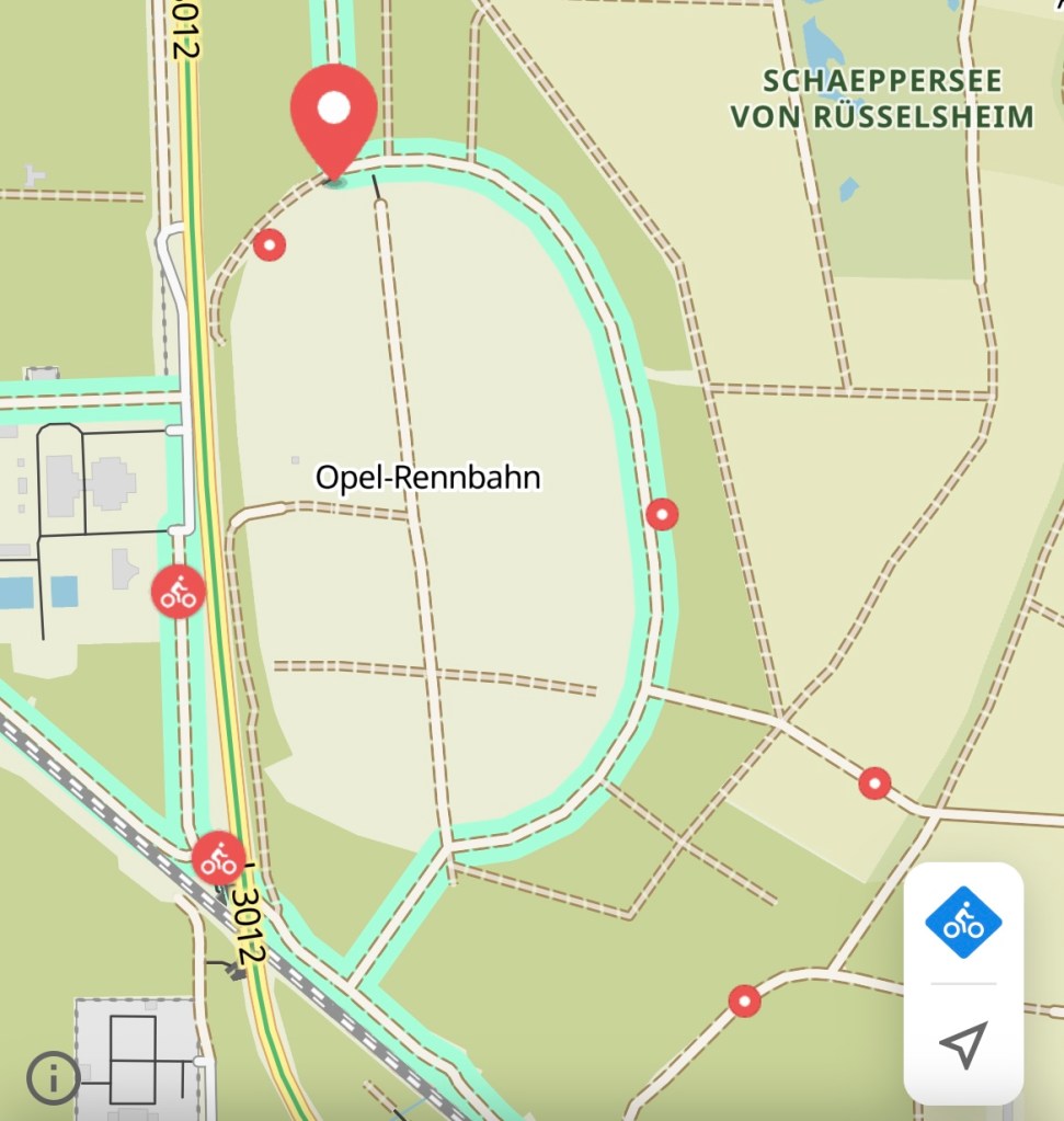 Aufgrund eines Vertrags von 1909 ist das Gelände südlich des Bischofsheimer Weges bis heute Eigentum der Stadt Mainz, das vom Forstamt Groß-Gerau bewirtschaftet wird. Nachdem die ehemalige Start- und Zielgerade dem Straßenbau – der Verlegung der L 3012 – zum Opfer fiel, ist die alte Rennstrecke (oder was von ihr blieb) nur noch ein trauriger Torso. Wer mit dem Fahrrad unterwegs oder gut zu Fuß ist, kann einen Teilabschnitt, rund um die Reste des Industriedenkmals, erlaufen oder erfahren (Foto zeigt einen Kartenausschnitt von kommot).