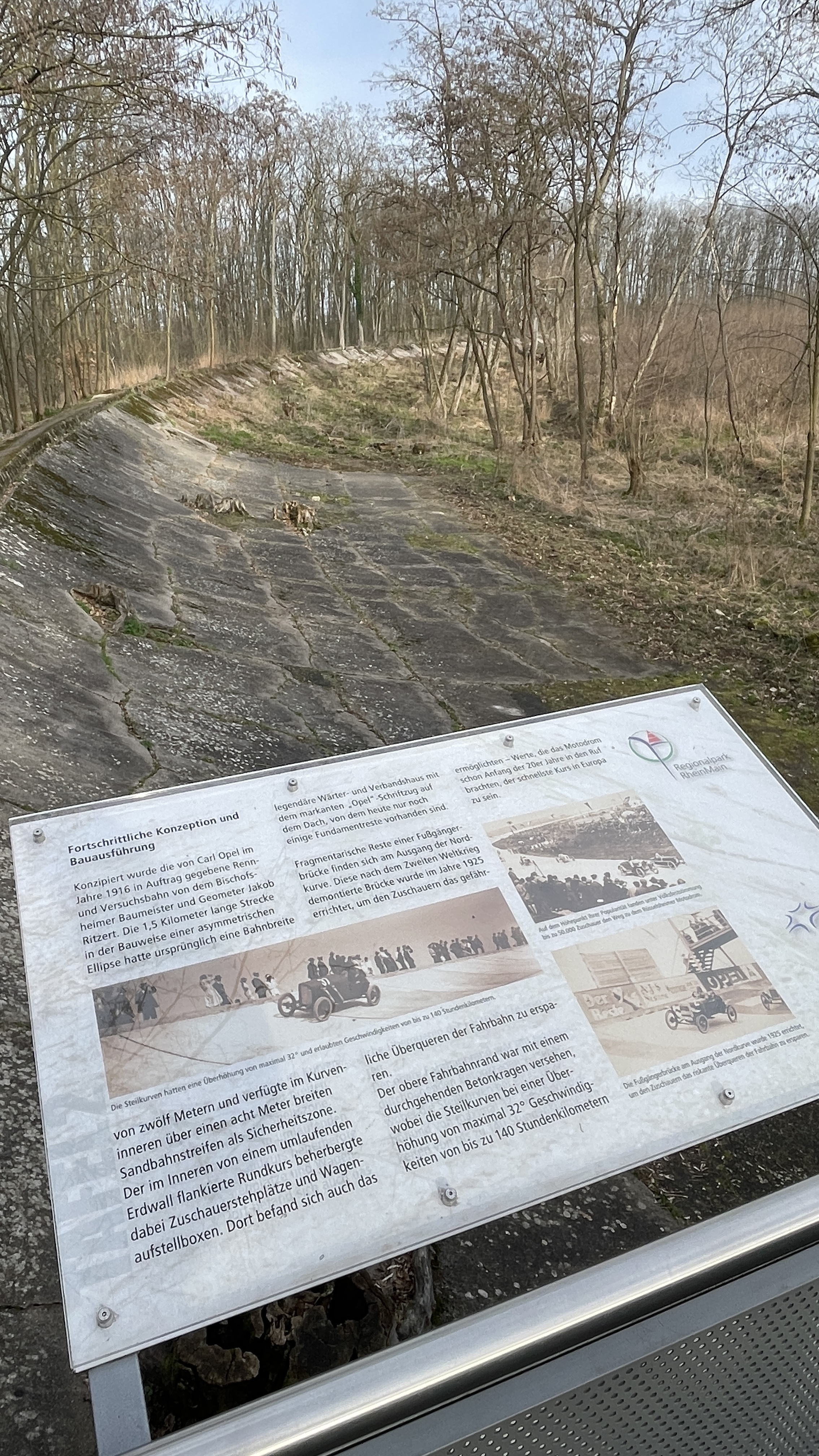 Da wollte ich schon lange mal hinfahren. Zur „Automobil-Einfahrbahn“ am „Schönauer Hof“, mit deren Bau 1917 begonnen wurde. Die Test- und später auch Rennstrecke von Opel, die nahe Rüsselsheim in einem Wald liegt“, ist mittlerweile eine Ruine, aber immer noch sehenswert. Kaum zu glauben, was sich hier vor gut 100 Jahren alles ereignet hat …