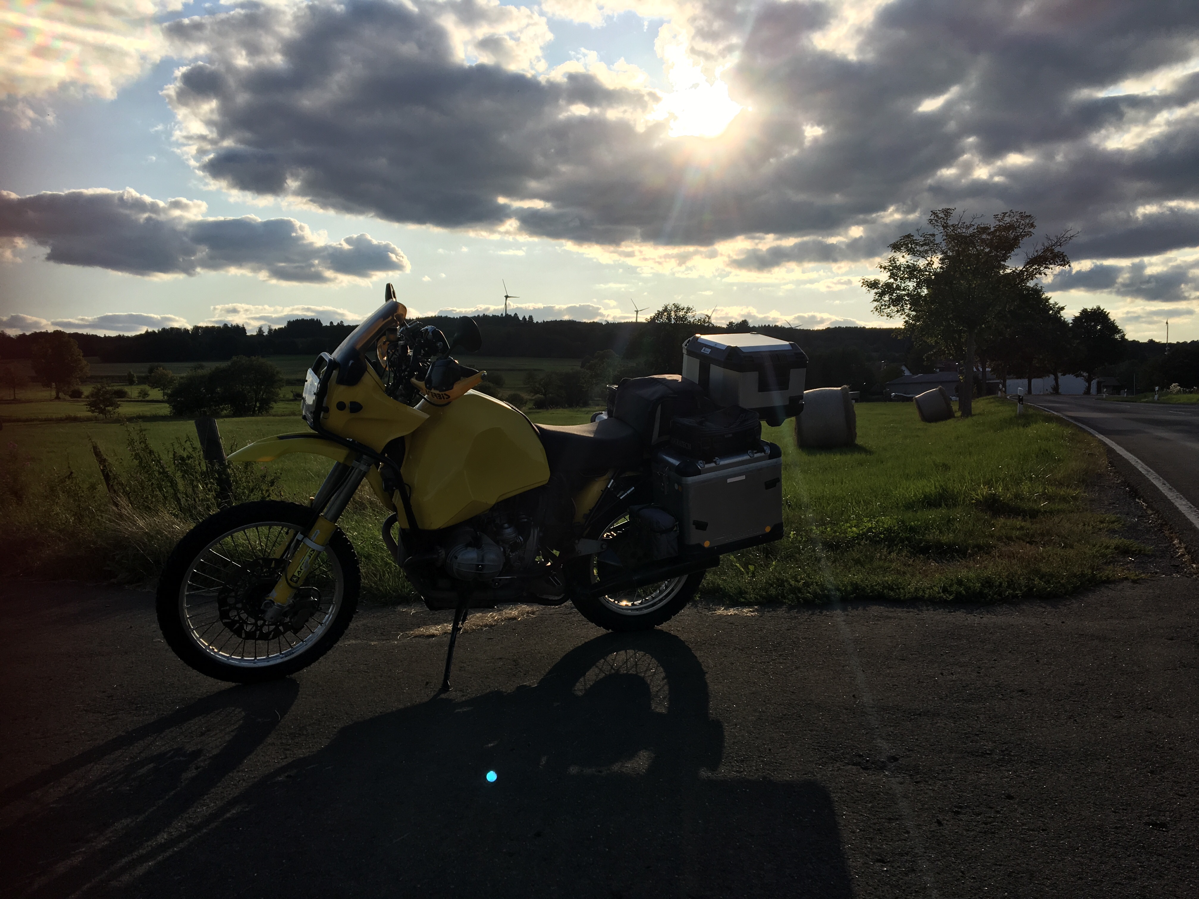 Die gelbe G/S braucht möglichst schnell 1.000 Kilometer auf der Uhr. Über den Winter sind die Ventilführungen gemacht worden und recht bald sollen die Köpfe nachgezogen werden. Damit der alte Boxer ohne weiteren Werkstattaufenthalt in die neue Saison starten kann. Also wird jede sich bietende Gelegenheit genutzt, ein paar Meter zu fahren. Wenn dann noch eine so tolle Abendstimmung vorherrscht, sind auch kleine Touren ein Genuss …