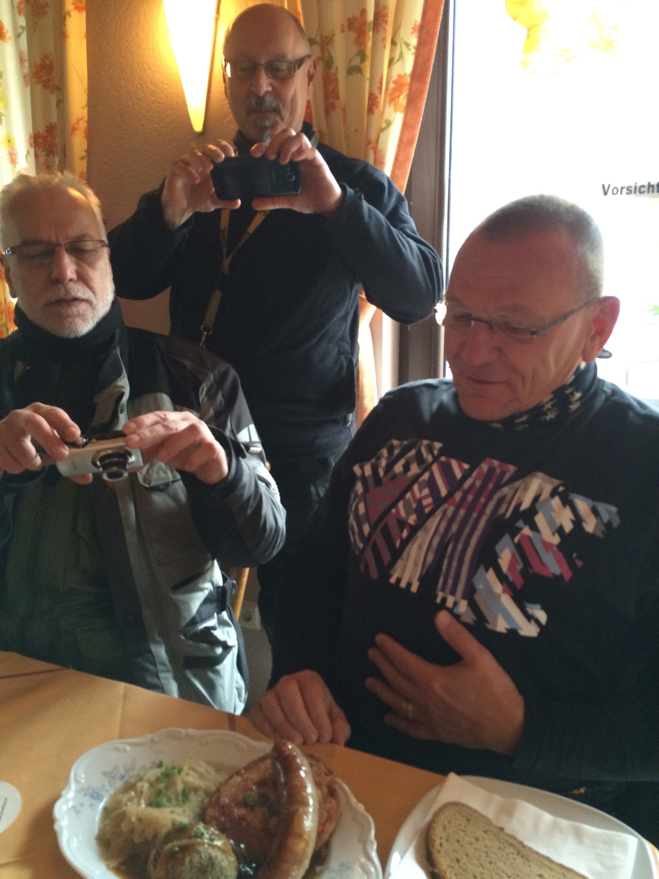 Gegen halb eins sind wir am Ziel. Noch einmal zusammen Mittag essen, dann fährt jeder individuell nach Hause. Ein Blick in die Speisekarte bietet für jeden etwas: die mächtige „Kanonenkugel“ und der ausladende „Hüttenteller“ sind so gewaltig, dass sie unbedingt im Bild festgehalten werden müssen.