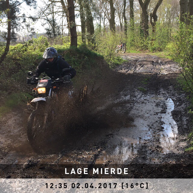Nach nur wenigen Metern Asphalt unter den Stollenreifen, haben wir den ersten Feldweg erreicht: eine morastige Piste erwartet uns, mit tiefen Schlammlöchern und einer interessanten Wegeführung. Vor mir tänzelt die Explorer, braucht häufig die ganze Wegesbreite um einigermaßen in der Spur zu bleiben und nimmt manchmal noch ein Stück vom benachbarten Acker mit. Aber: Dirk bleibt aufrecht und auch Mario mit der Africa Twin schlägt sich wacker – Kompliment!