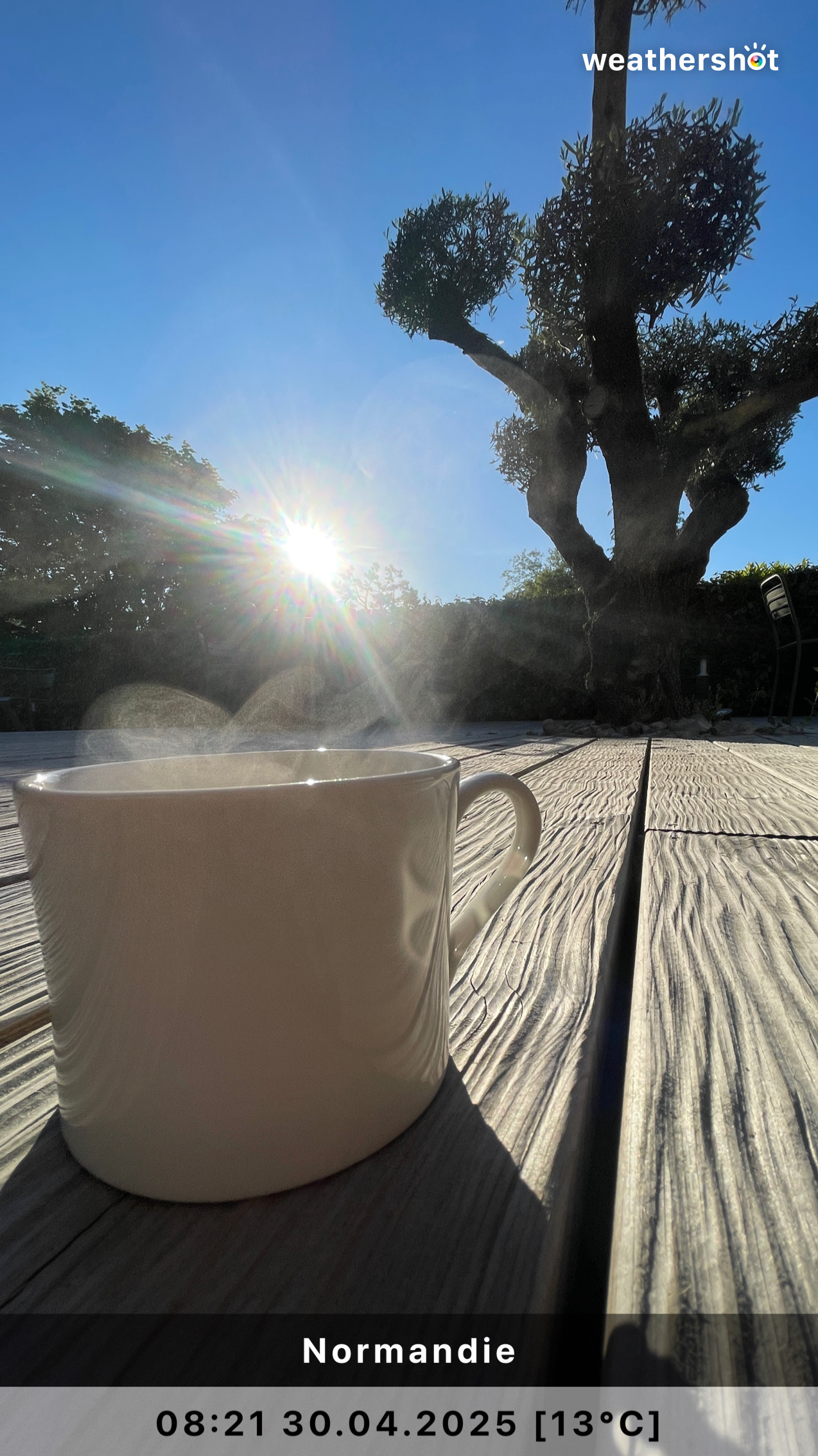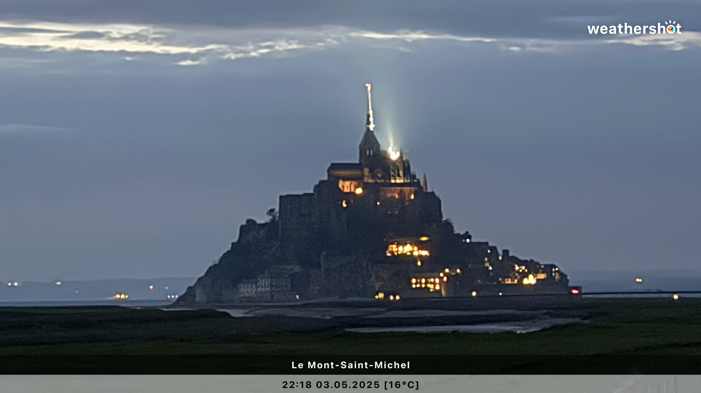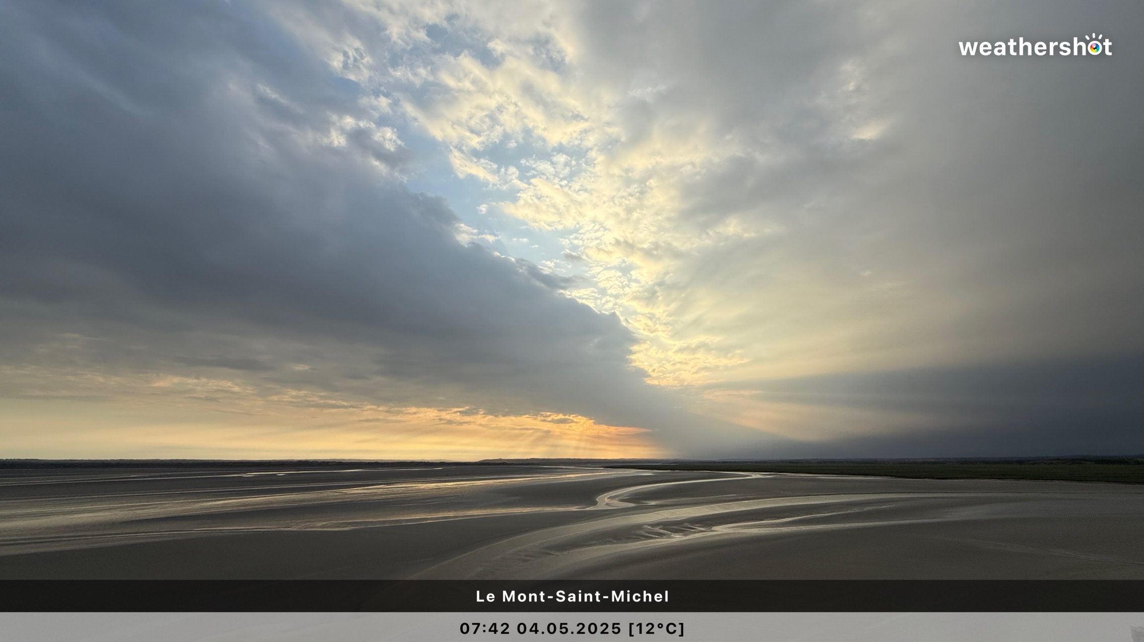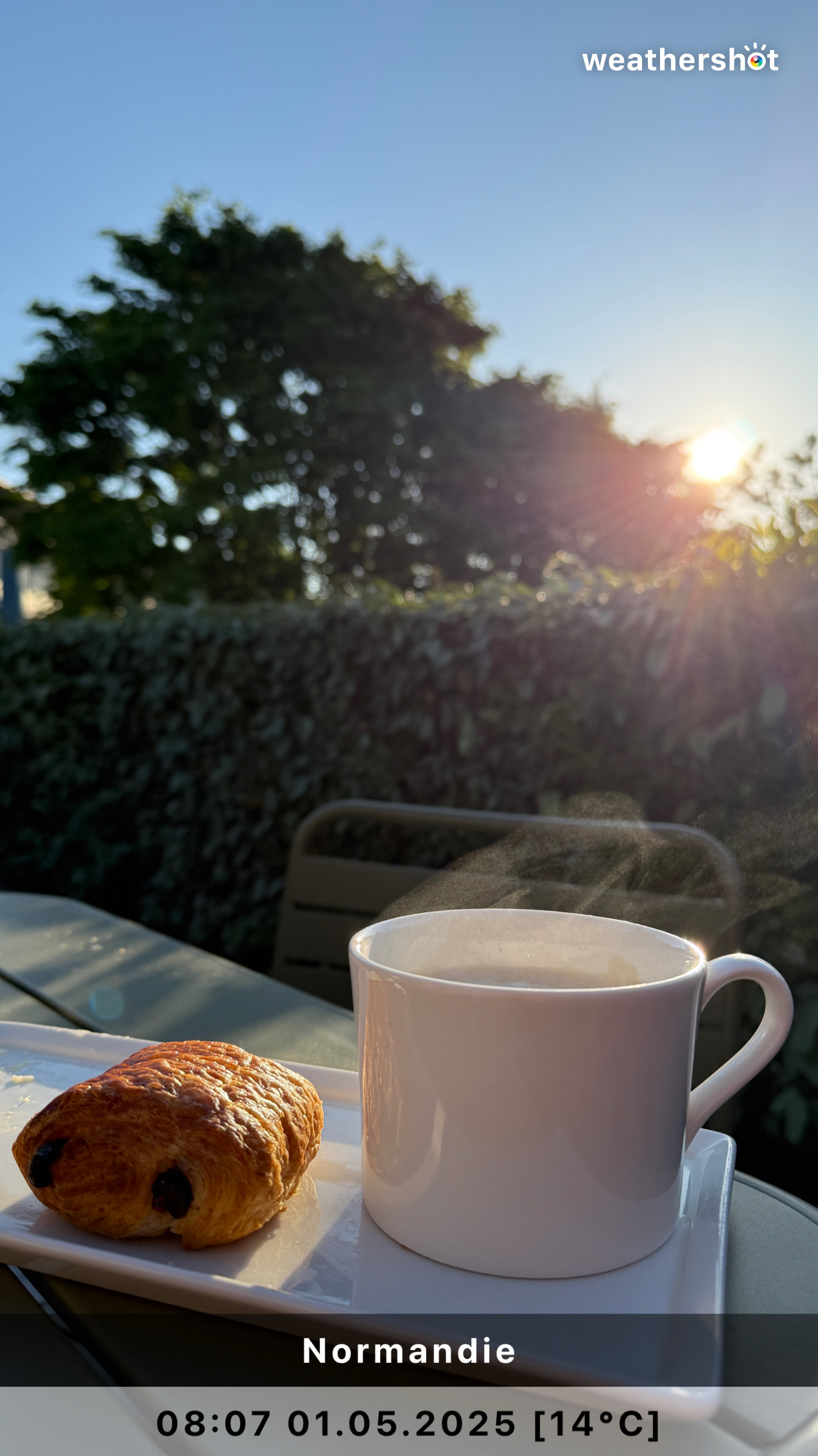 NORMANDIE – So. 4.5.2025: Der Sonnenaufgang ist anders als erhofft, aber nicht minder eindrucksvoll. Ich laufe noch mal rüber, zum Klosterberg, um in den frühen Morgenstunden ein paar Fotos ohne „störende“ Menschen machen zu können …