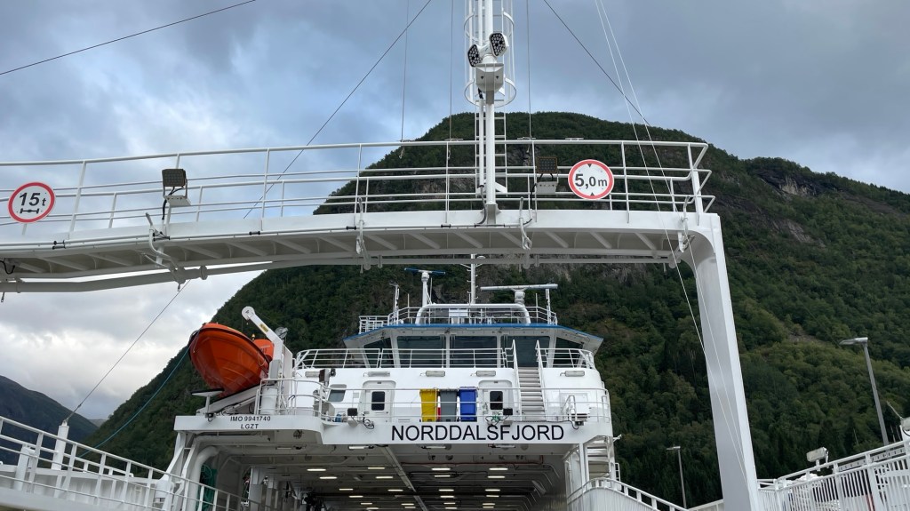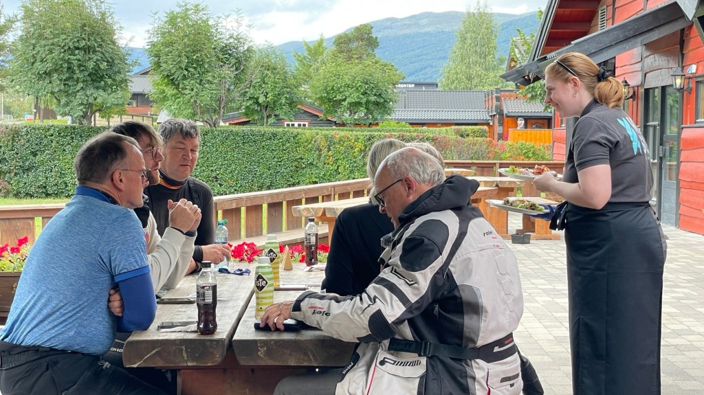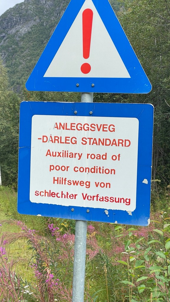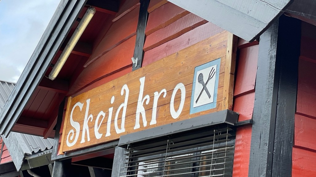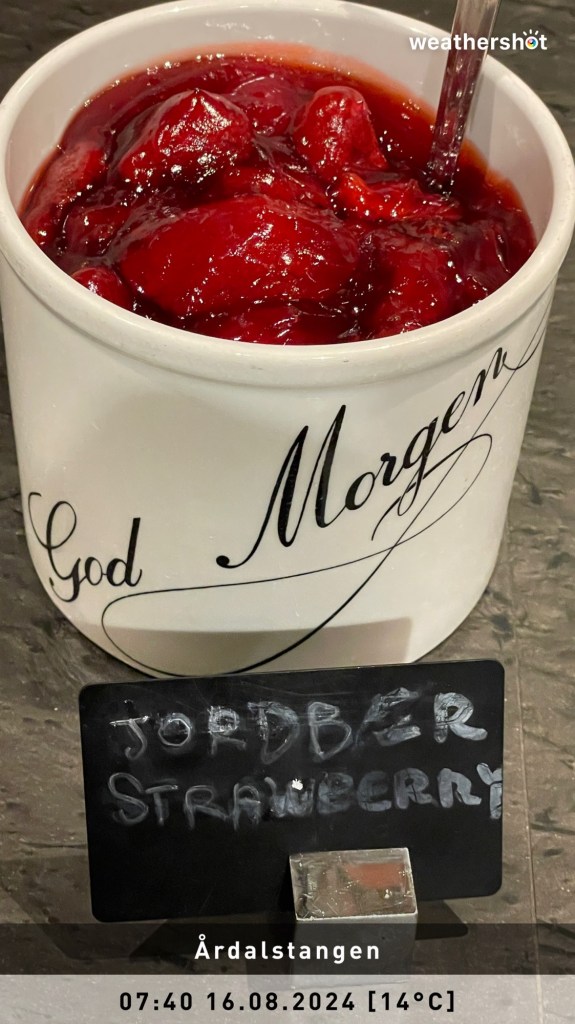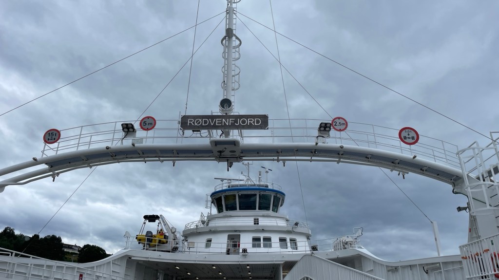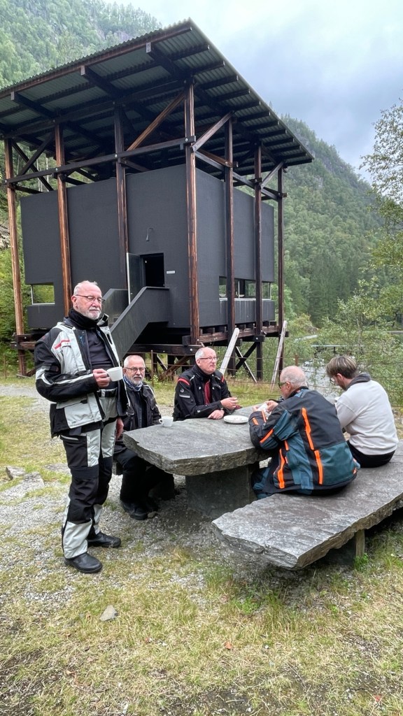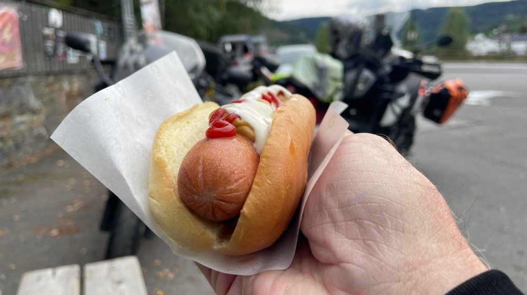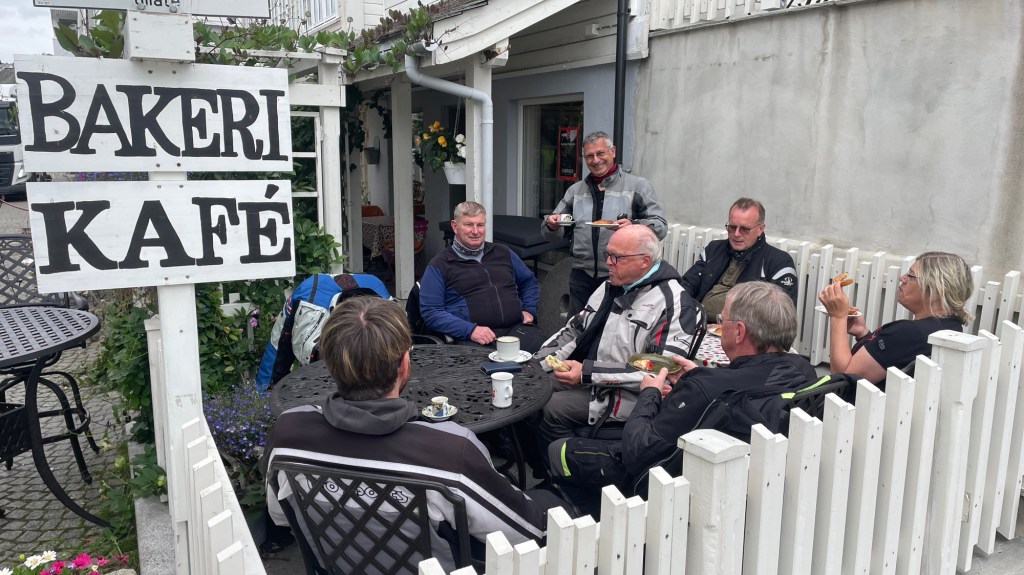 Da wir gut in der Zeit liegen, können wir an einer Raststätte noch eine Kaffeepause einlegen und Proviant für die Fähre kaufen: unter anderem Knäckebot mit Brunost, dem norgewischen Karamell-Käse. Diese „Perversität“ muss zum Schluss einfach sein …