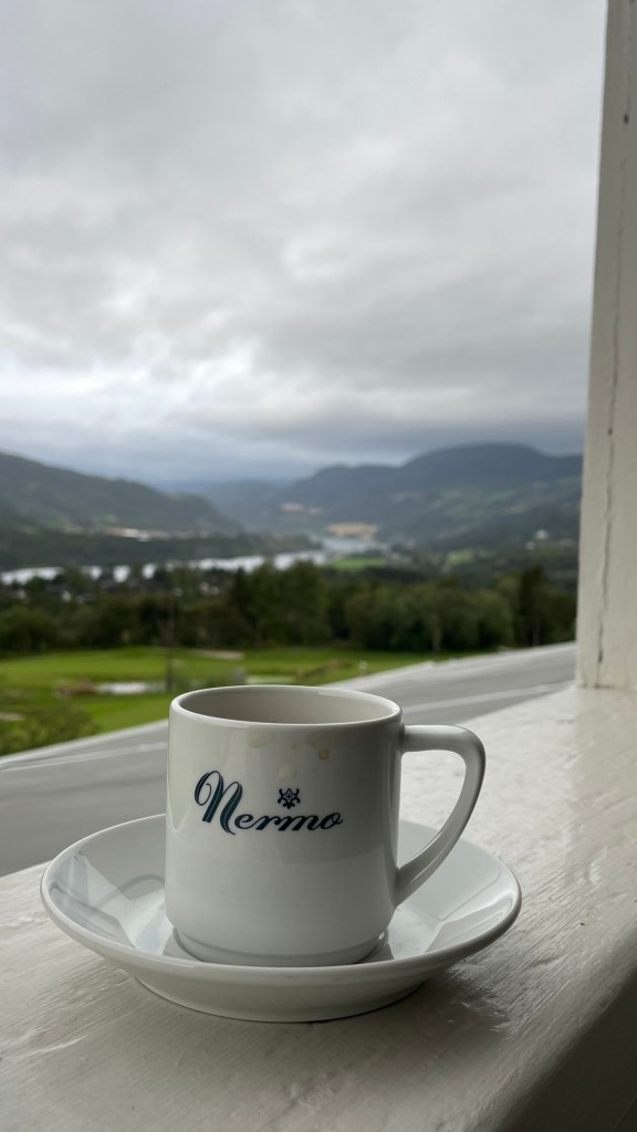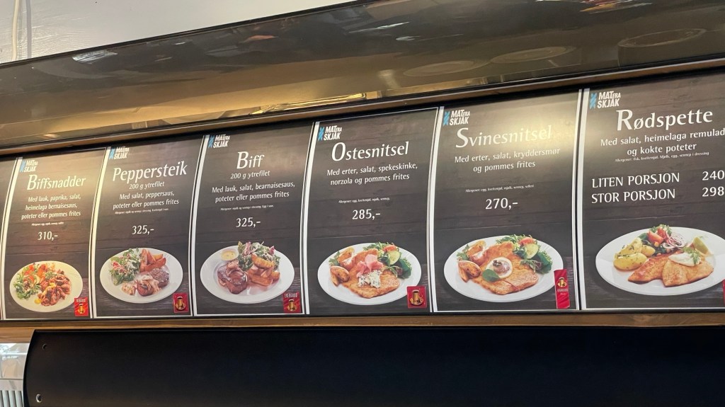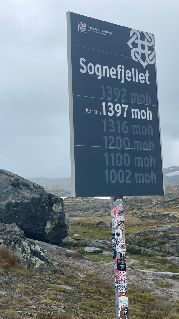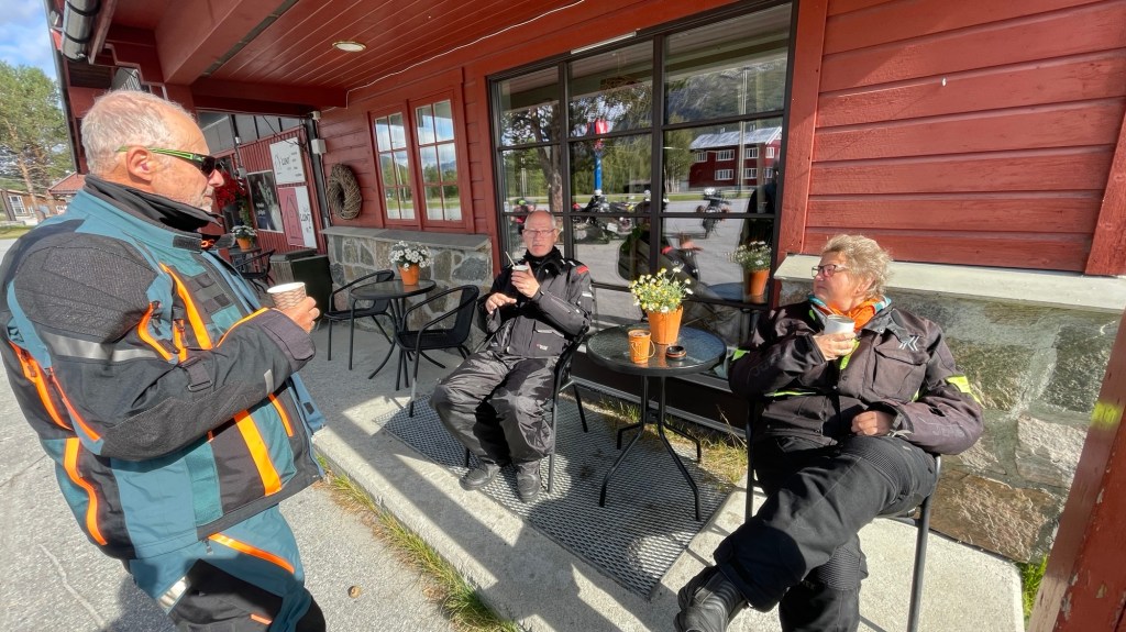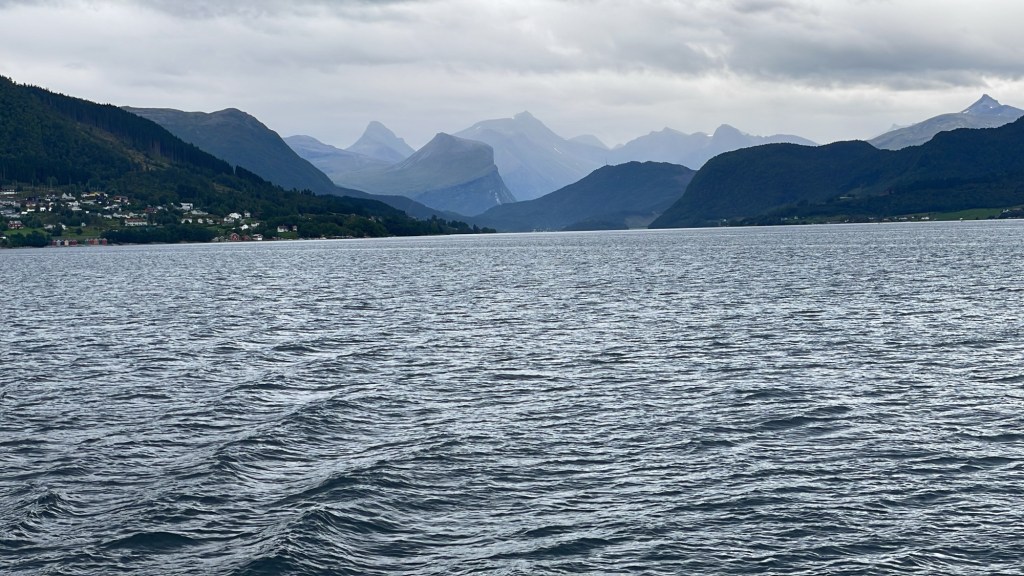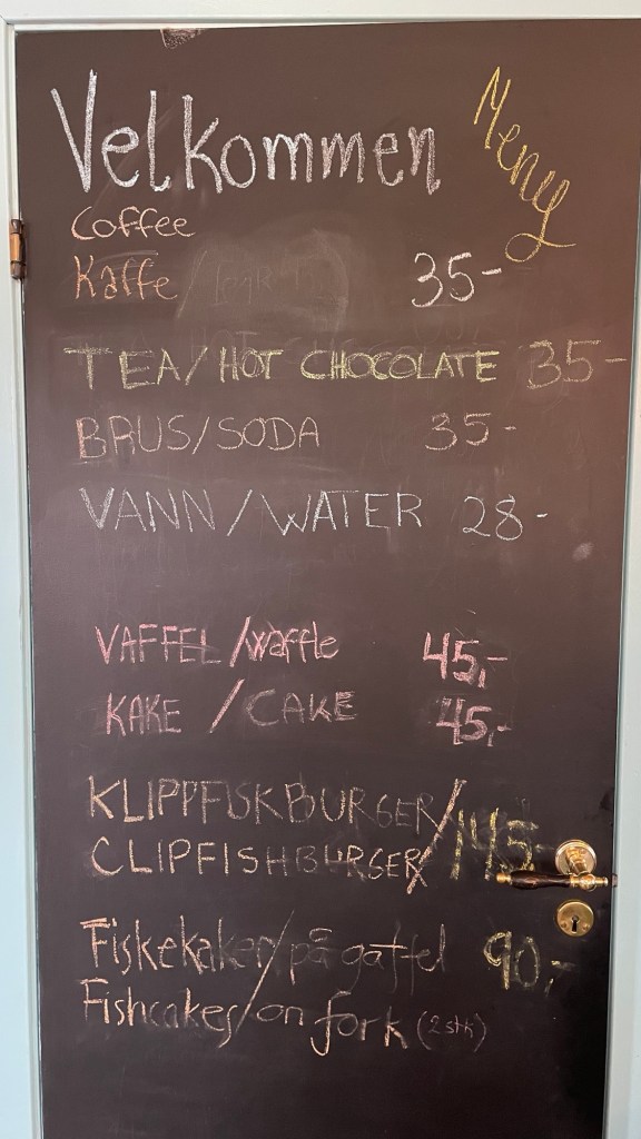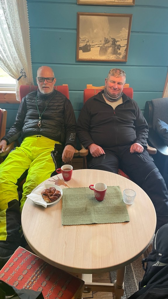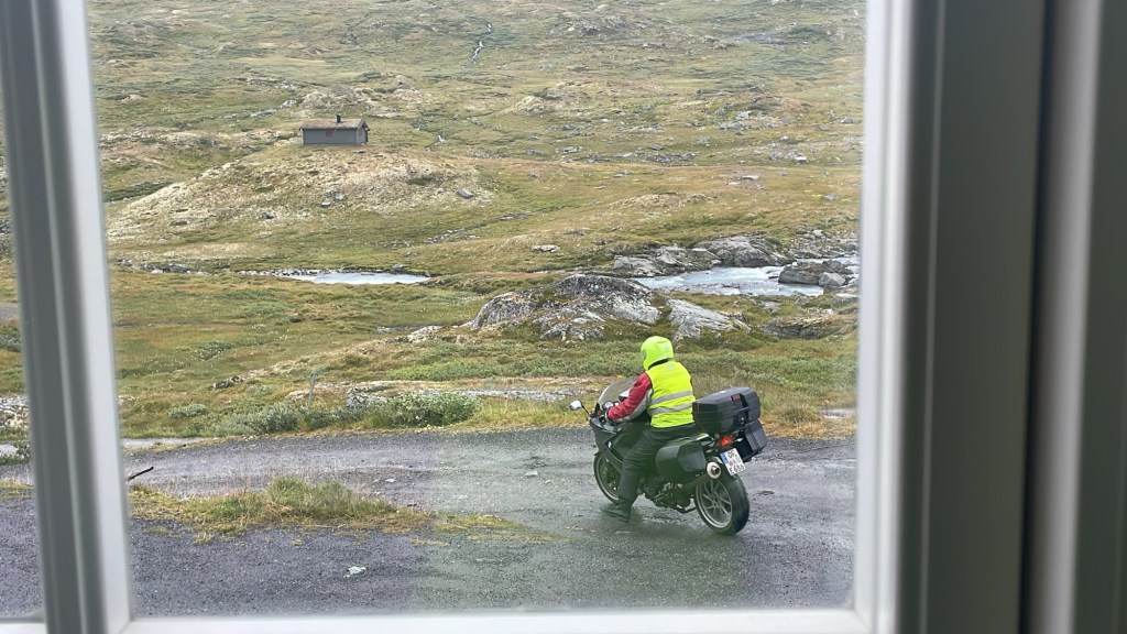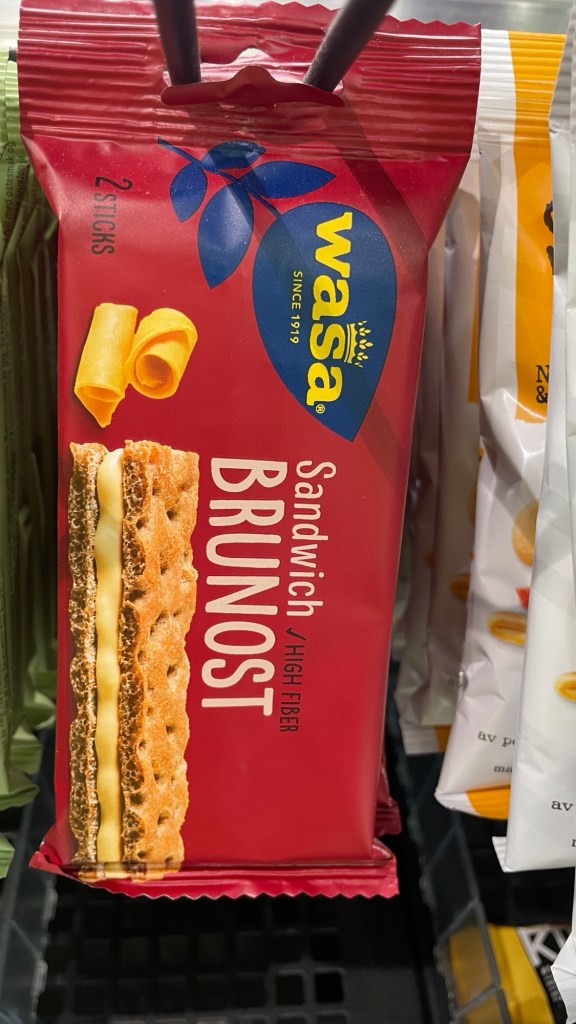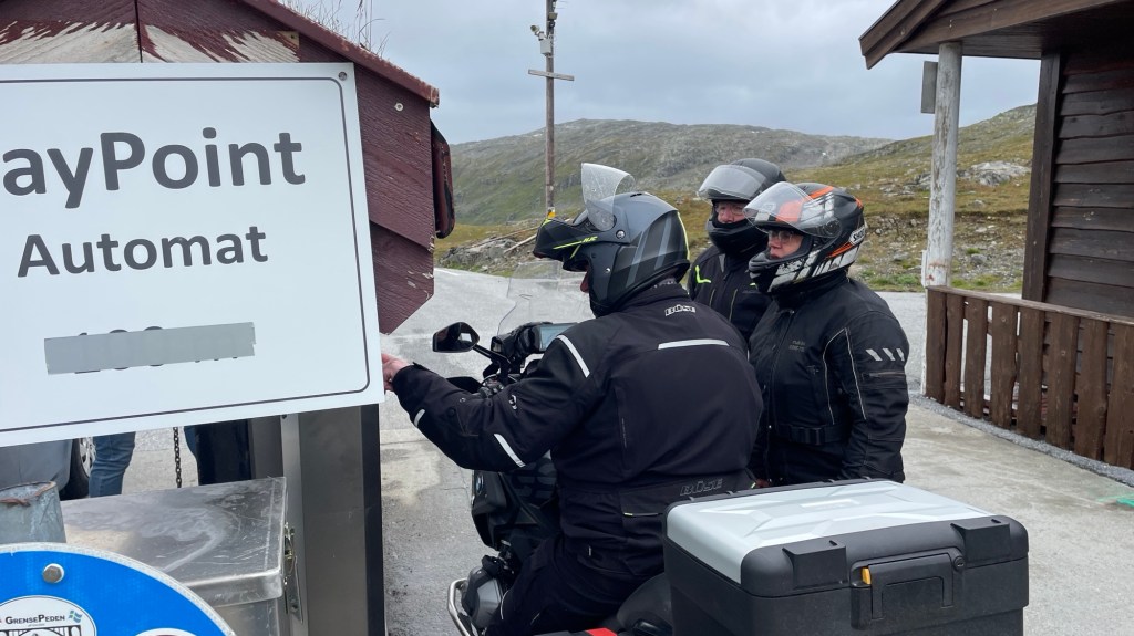 Da wir gut in der Zeit liegen, können wir an einer Raststätte noch eine Kaffeepause einlegen und Proviant für die Fähre kaufen: unter anderem Knäckebot mit Brunost, dem norgewischen Karamell-Käse. Diese „Perversität“ muss zum Schluss einfach sein …