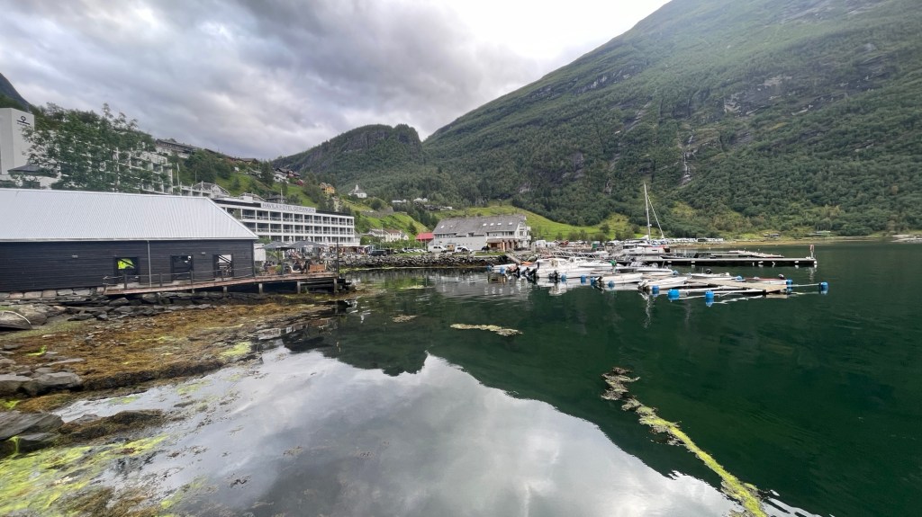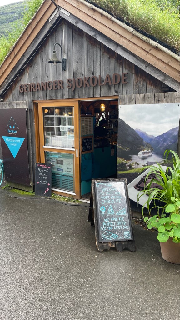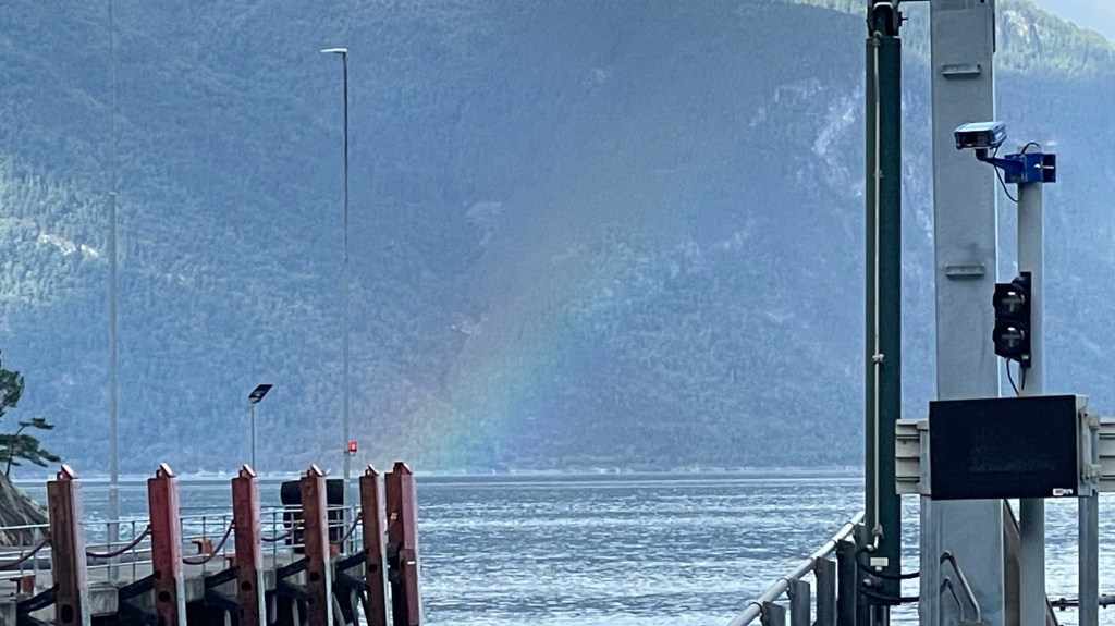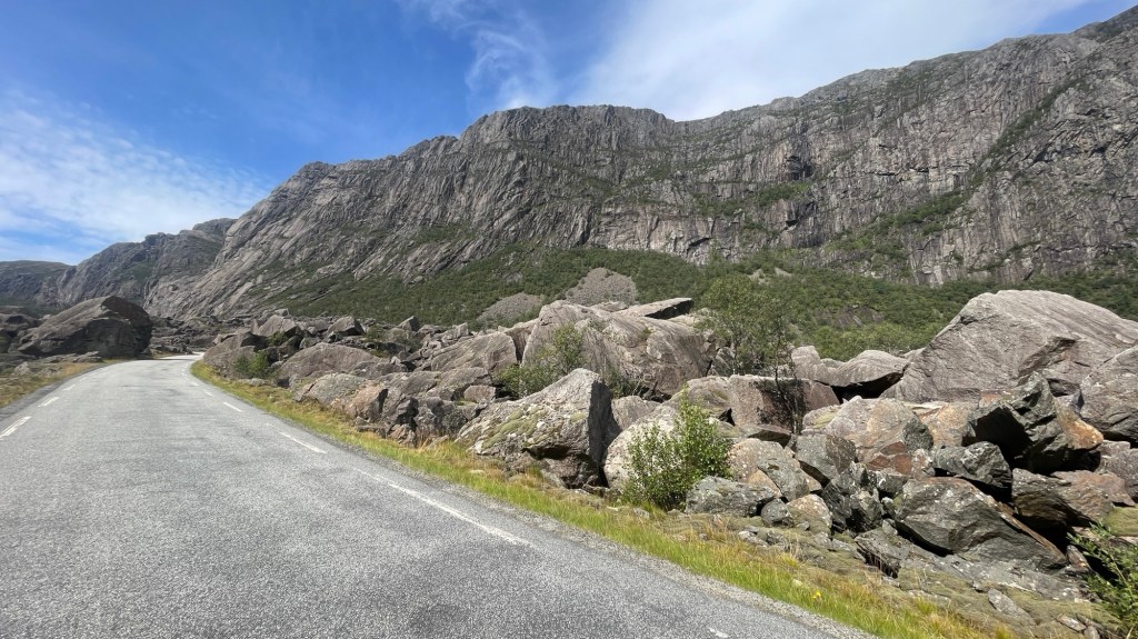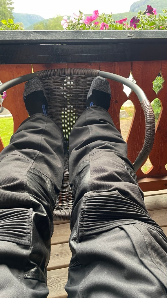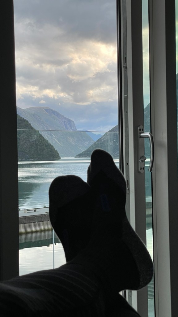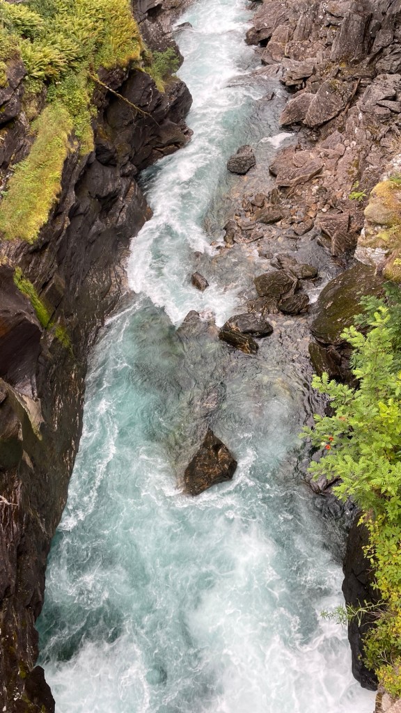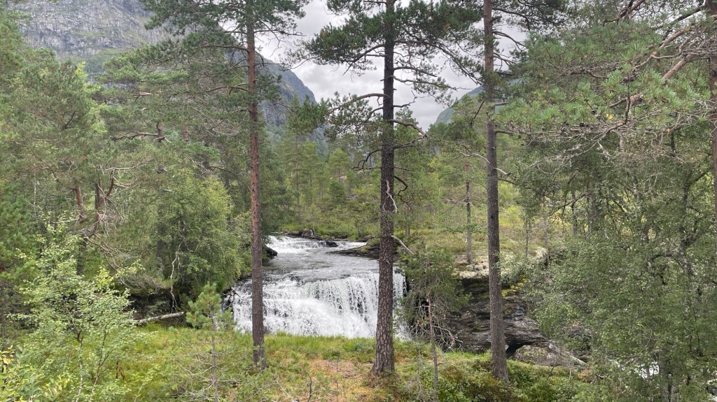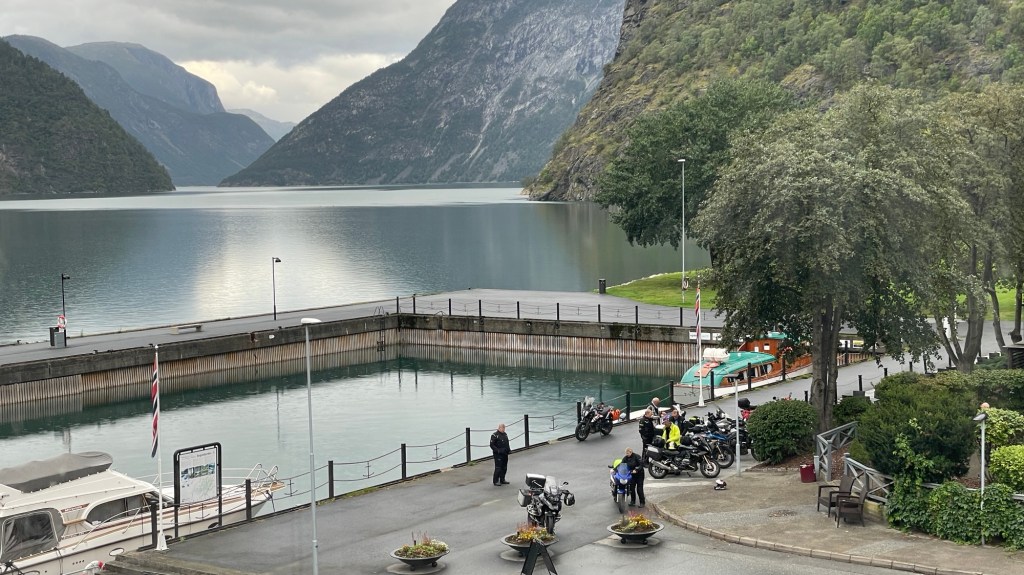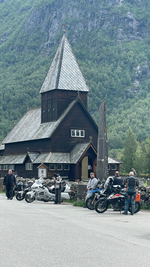 Da wir gut in der Zeit liegen, können wir an einer Raststätte noch eine Kaffeepause einlegen und Proviant für die Fähre kaufen: unter anderem Knäckebot mit Brunost, dem norgewischen Karamell-Käse. Diese „Perversität“ muss zum Schluss einfach sein …