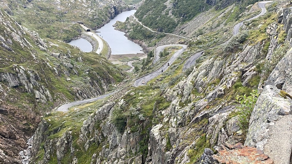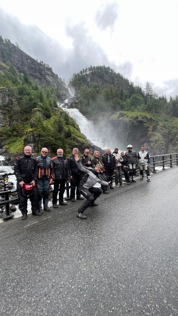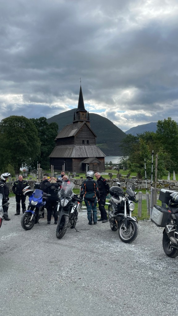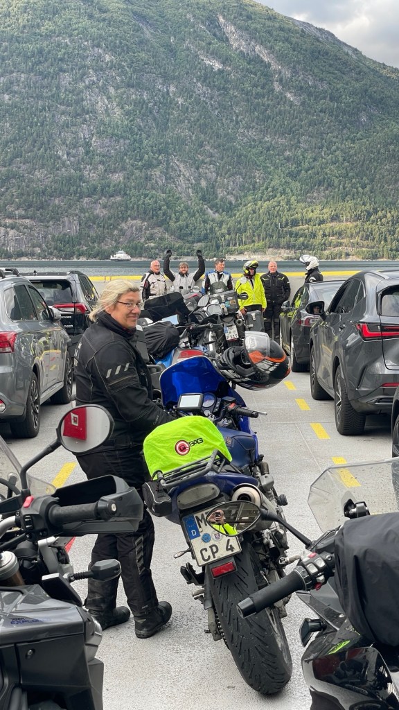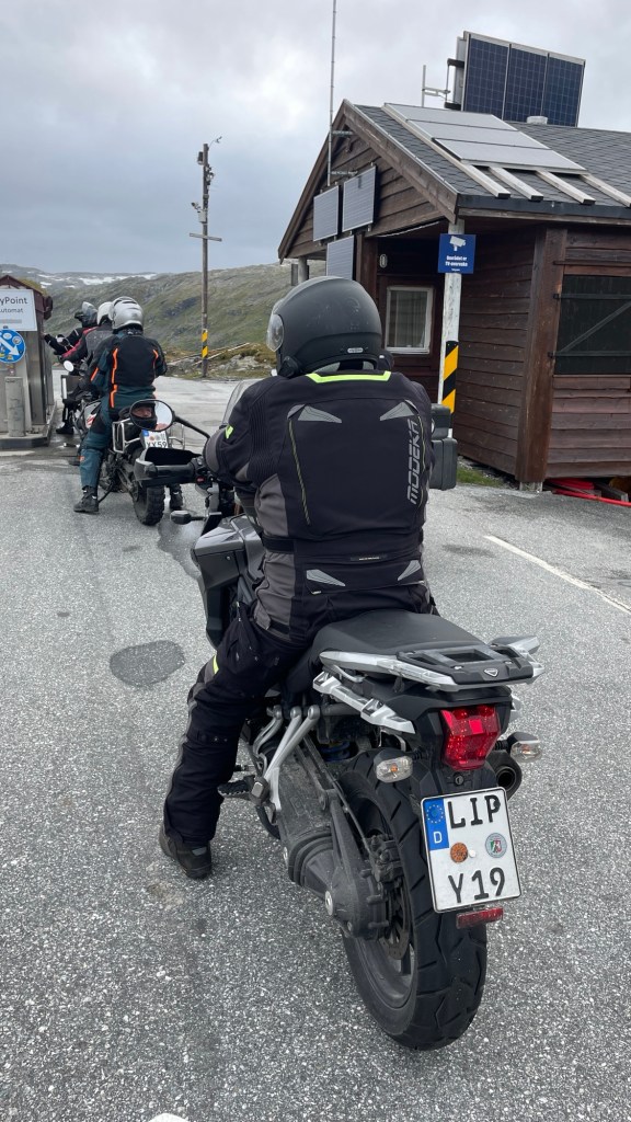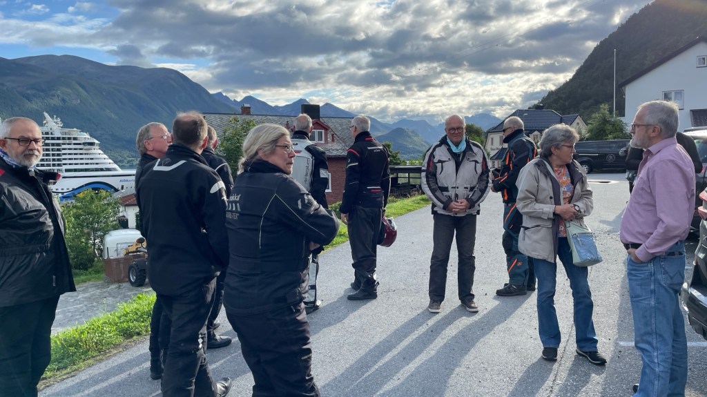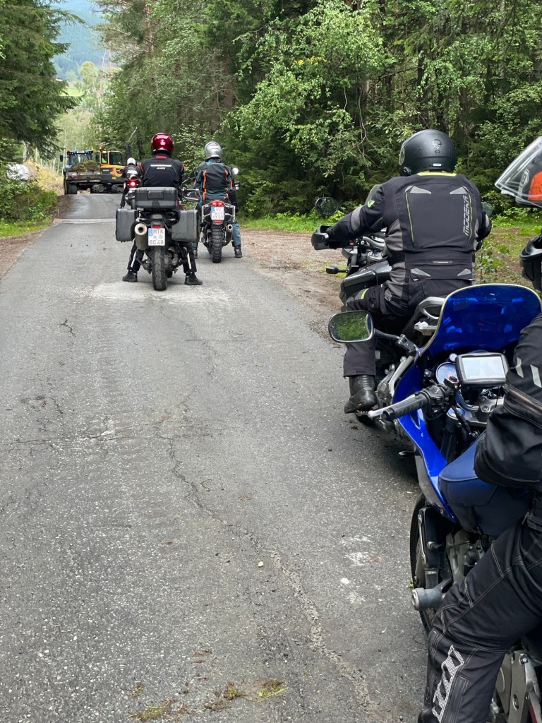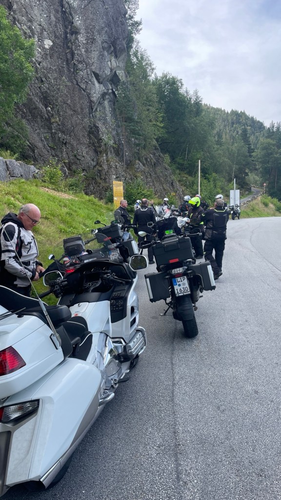 Es wird dann doch nach acht, bis sich unser Trupp in Bewegung setzt. Wir wollen versuchen, Oslo gemeinsam zu erreichen und werfen um in einer Kolonne von 14 Motorrädern auf die Europastraße. Das funktioniert erstaunlich gut. Vereinzelt mogelt sich ein Auto an einer Auffahrt in die Gruppe; wir verlieren uns aber nie aus den Augen.