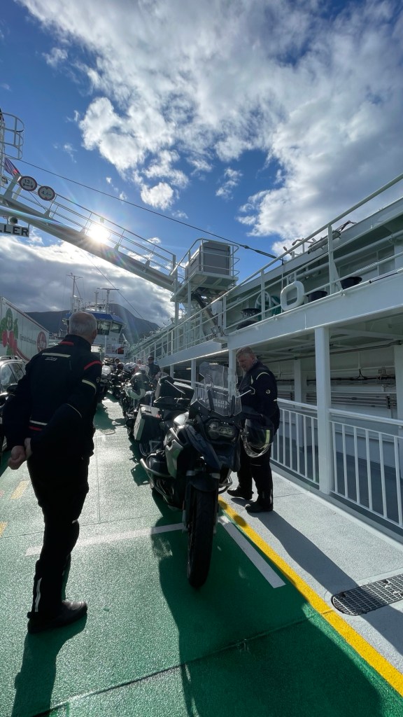 Dann dürfen wir an Bord. Mit Schwung geht es die steile Rampe hinauf, ein Spanngurt über die Sitzbank und unsere Rückreise nach Kiel kann beginnen …