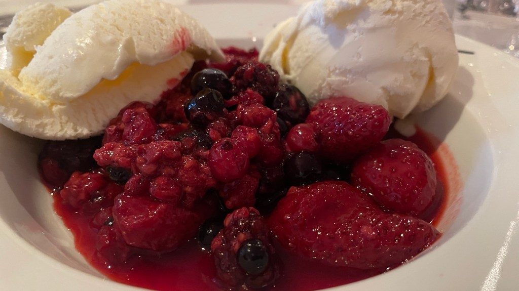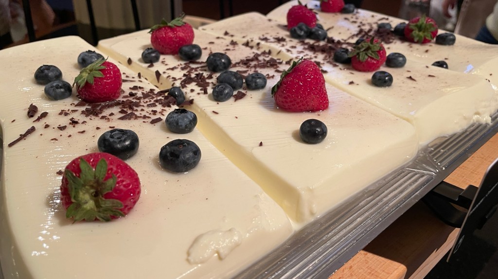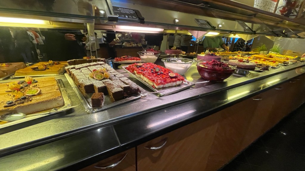 Natürlich gab es Fisch in allen Variationen. Ein Genuss auch das Angebot an verschiedenen Sorten Käse, dazu karamellisierte Nüsse, eingemachten Ingwer mit einer leichten Schärfe und Aprikosenkompott. Der „Knaller“ aber ist die Auswahl an Süßspeisen – unglaublich …