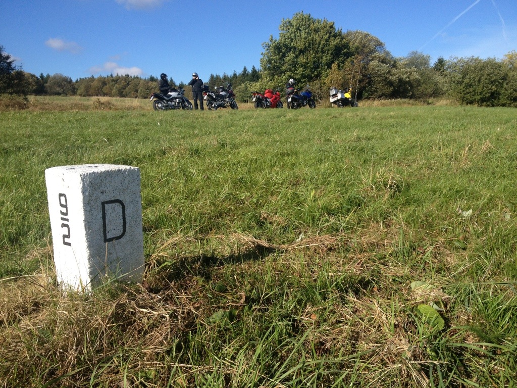 Während die Gruppe wartet, schaue ich mal, ob der holprige Pfad, der nach Polen führt, für alle passierbar sein dürfte. Schließlich ist die Weiterfahrt nicht ausdrücklich verboten. Es geht ein Stück in den Wald hinein. Dann tauchen links und rechts des Weges Schilder auf, die auf einen militärischen Sperrbereich hinweisen. Kurz darauf stehen auf einem Parkplatz erste Armeefahrzeuge. Als dann in 400 Metern die Durchfahrt verboten wird, drehe ich um. Wahrscheinlich würden wir erheblichen Ärger kriegen, wenn wir weiterfahren und erwischt würden.