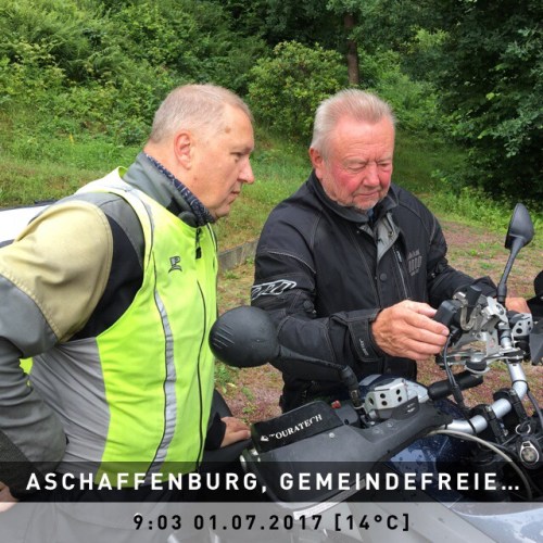 Ein banger Blick zum Himmel – nach Regen sieht das eigentlich nicht aus, obwohl der doch prognostiziert war. Das Regenradar zeigt die Schlechtwetterfront westlich von uns. Wir wollen in den Süden, das könnte klappen. Und so mäandern wir die ersten 70 Kilometer auf möglichst kleinen durch den Spessart.