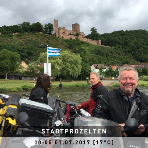 In Stadtprozelten geht es mit einer kleinen Fähre über den Main und schließlich – dem Lauf der Tauber folgend, nach Bronnbach. Wir finden einen äußerst idyllischen Parkplatz für die Motorräder und auf der anderen Straßenseite das kleine Lokal zur ersten Rast.
