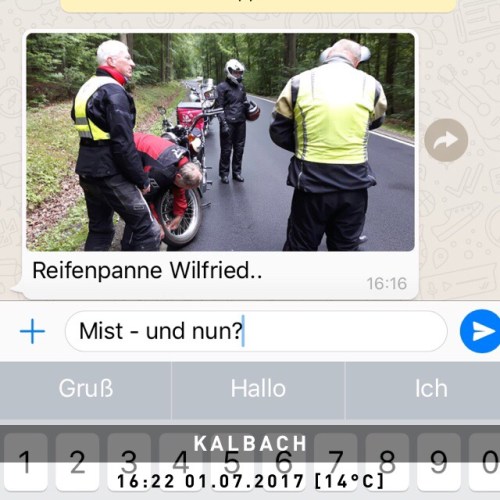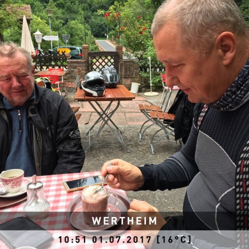 Wir schlagen einen weiten Bogen Richtung Rhön und erreichen „Taufstein“ am späten Nachmittag. Im gleichnamigen Hotel haben wir uns zur Kuchenpause angekündigt und steigen von den Moppeds, als die ersten Regentropfen fallen. Das ist timing ;-(