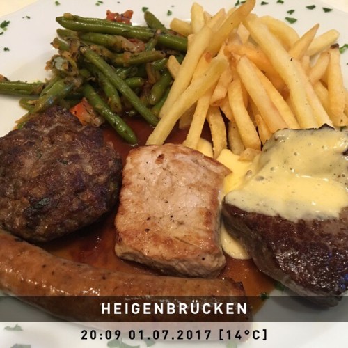 Gegen 18 Uhr rollen wir auf dem Hotelparkplatz aus. Jetzt eine heiße Dusche und dann zum Abendessen. Statt Grillfest gibt es Grillteller – lecker.