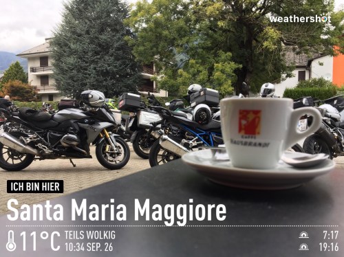 Und so rollen wir nach dem Frühstück gemütlich über die Uferstraße, die uns von Ascona Richtung Cannobio auf der italienischen Seite führt. Immer wieder bieten sich dabei prachtvolle Ausblicke auf den See. In Cannobio zweigen wir ins gleichnamige Tal ab und bewältigen die erste von ungezählten Kurvenorgien des heutigen Tages. Auf äußerst schmaler Trasse werfen wir die Moppeds ums Eck, dass es nur so eine Pracht ist. In Santa Maria Maggiore ist dann Zeit für die erste Kaffeepause. Endlich wieder zivile Preise: ein Euro für den Espresso – das ist doch ein Wort 😉