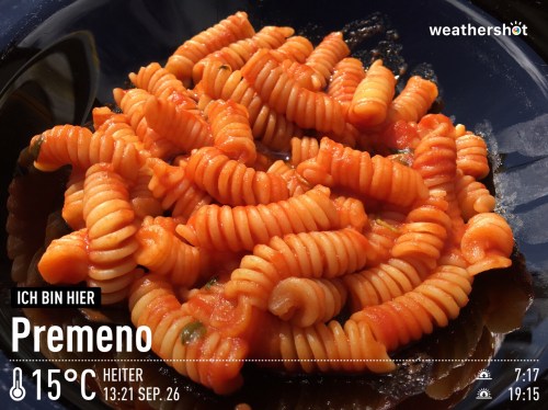 Auf keinen Fall. Gnade findet allenfalls der Plan, die großen Tische in die Sonne zu stellen. Etwas umständlich, aber der Patrone ist zufrieden. Bis Dieter mit seiner Gruppe eintrifft. Noch einmal acht Personen zu verköstigen, das übersteigt seine organisatorischen Möglichkeiten. Also muss sich Dieter im nächsten Ort was suchen – was auch gelingt – während wir einmal Pasta für alle bestellen.