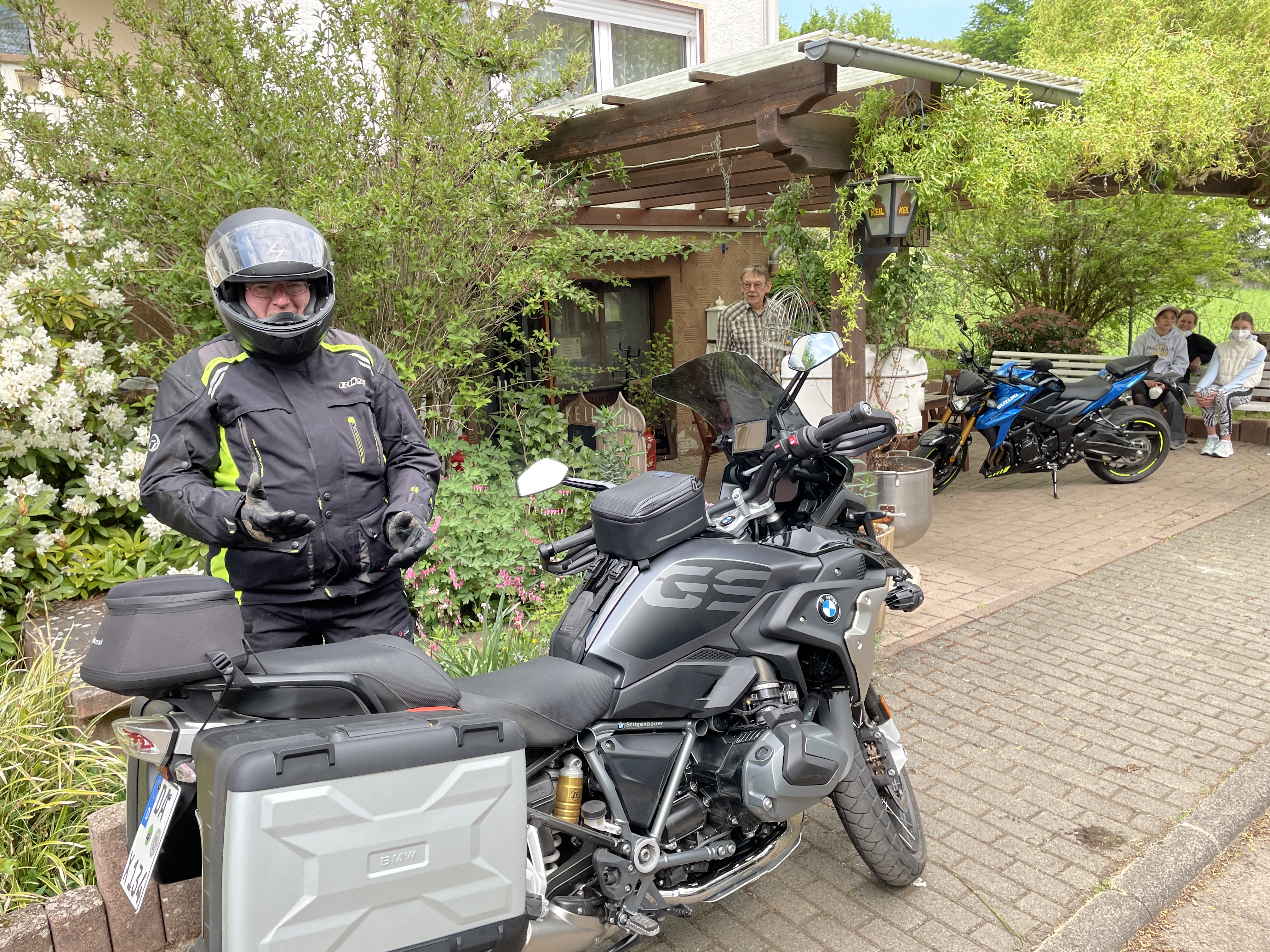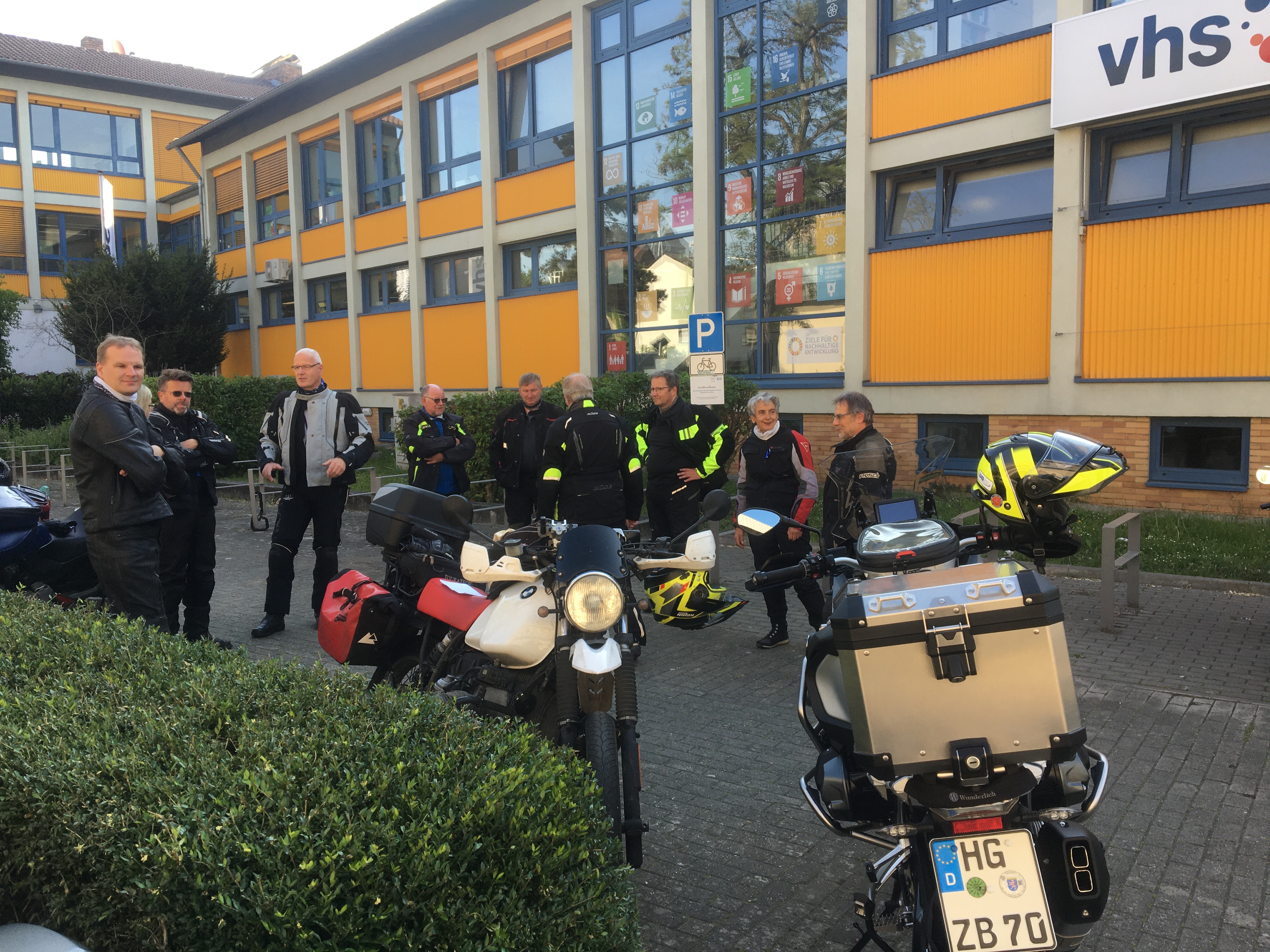 Treffpunkt ist am Samstagmorgen der Parkplatz an der Volkshochschule des Main-Taunus-Kreises; von hier aus werden wir um 9:00 Uhr starten. Mit insgesamt 12 Maschinen machen wir uns auf den Weg – gefahren wird in zwei Gruppen.