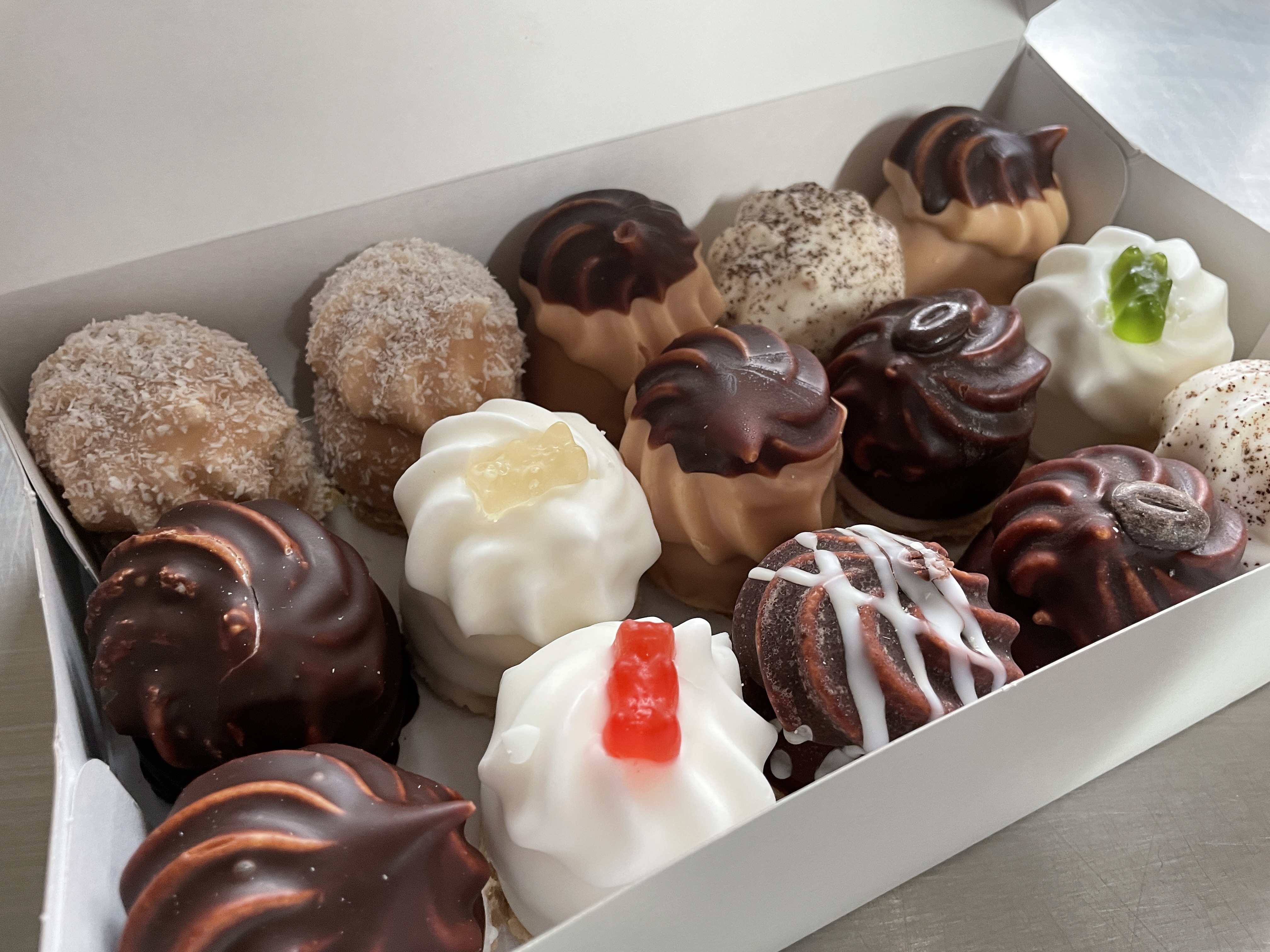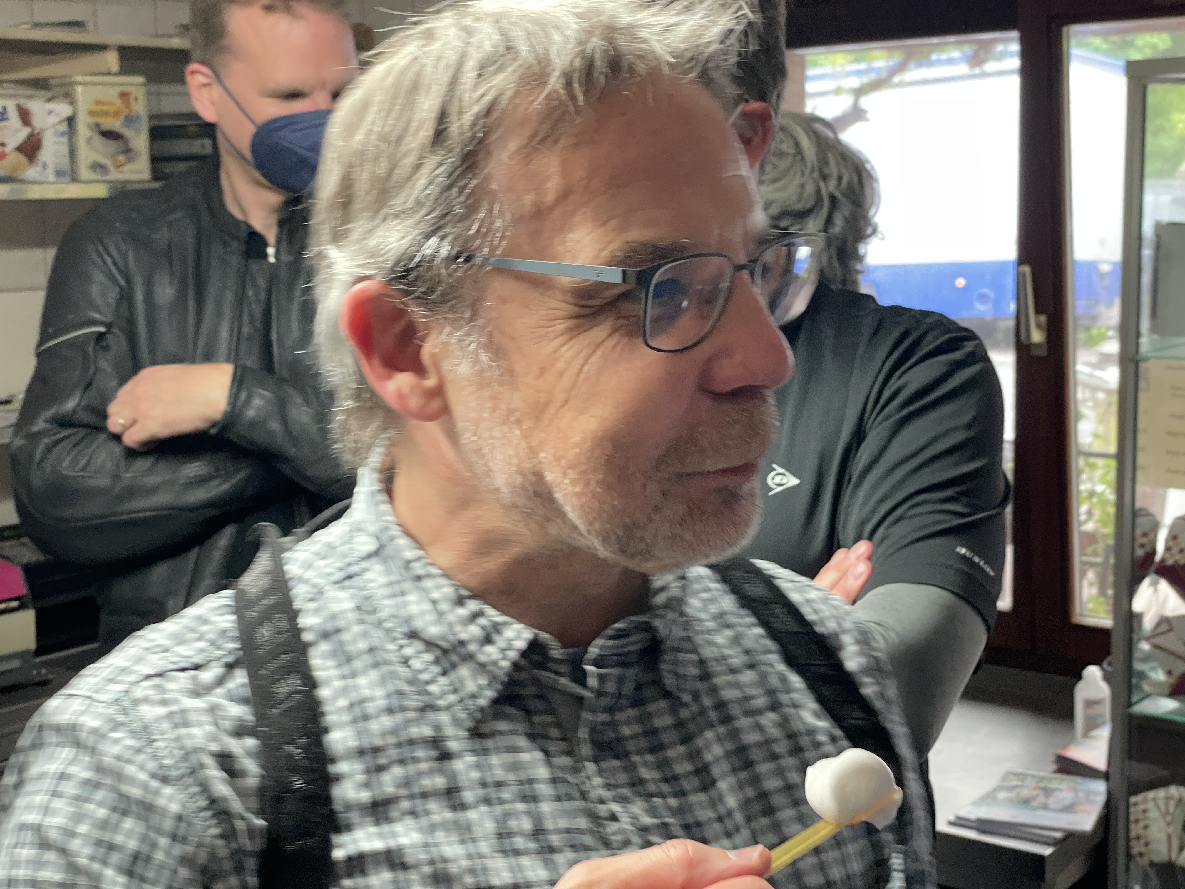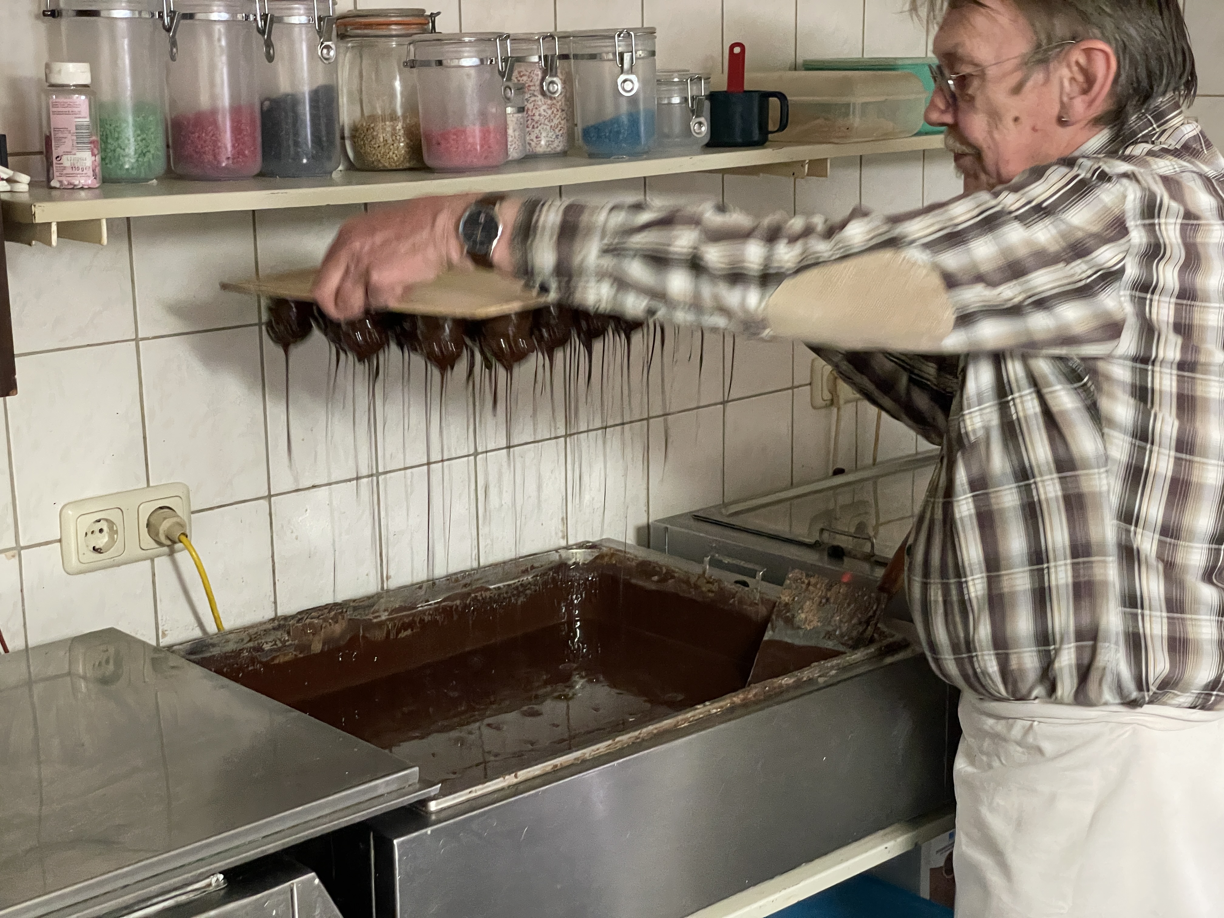 „Fast alles ist möglich“, sagt er, zum Beispiel auch ein Schokokuss mit Waldmeistergeschmack – lecker. Sind die Schokoküsse aufgespritzt – die von Wolfgang Keil tragen als Erkennungsmerkmal ein kleines Krönchen -, werden sie ins Schokolade getaucht und sind gut 20 Minuten fertig zum Verzehr. Wir schauen im begeistert zu uns freuen uns über die Kiste mit einer Auswahl an 15 feinsten Schokoküsse, die jeder von uns erhält. Nicht alle sind unbeschadet zu Hause angekommen …