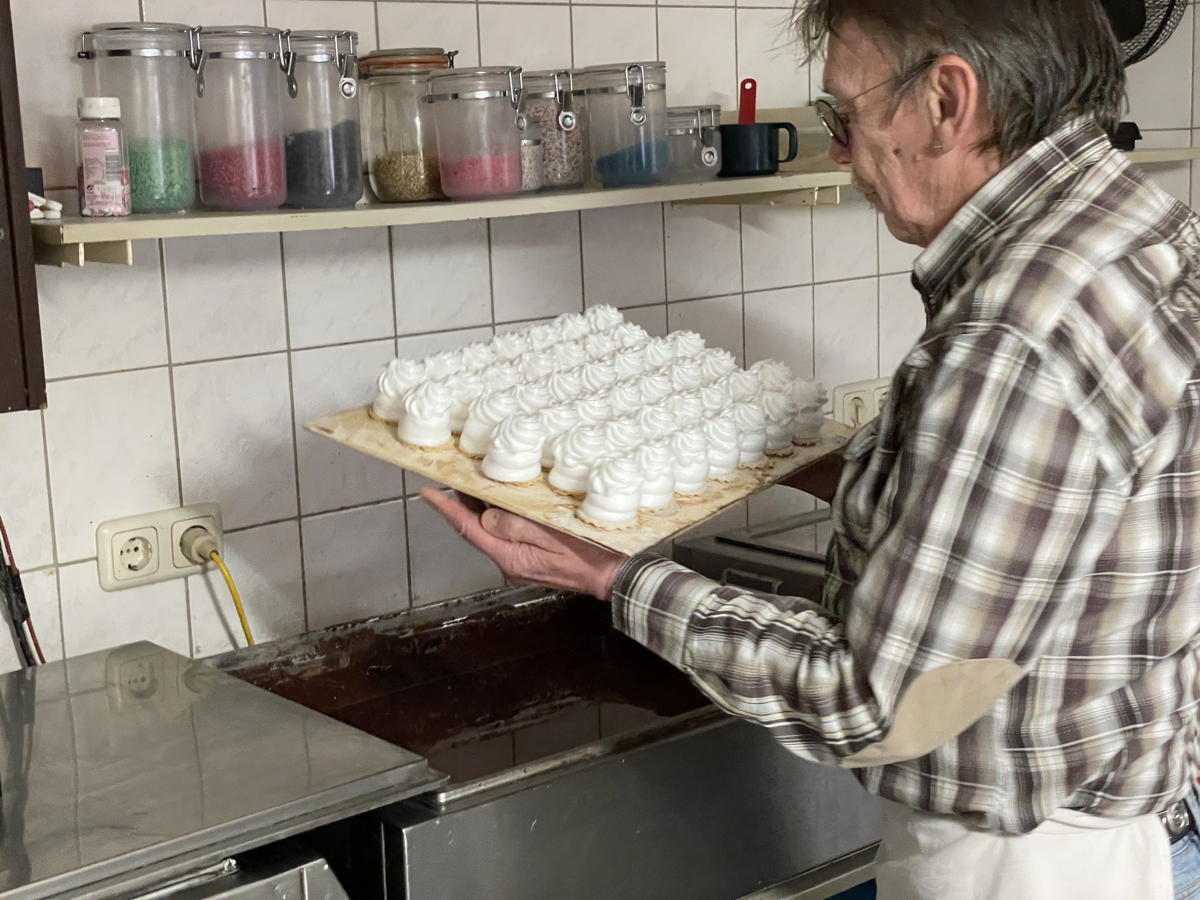 In Wingershausen, nahe Schotten, produziert Wolfgang Keil seit vielen Jahren seine Schokoküsse. Nach eigenen Angaben ist er in Deutschland der Einzige, der dies vollständig in Handarbeit tut. Die einzige Maschine, die er nutzt, ist ein großer Schneebesen, der das Eiweiss schaumig schlägt. Vor drei Jahren waren wir schon einmal im Vogelsberg, um ihm bei der Arbeit zuzuschauen. Jetzt wollen wir erneut zu einem informativen Besuch aufbrechen.