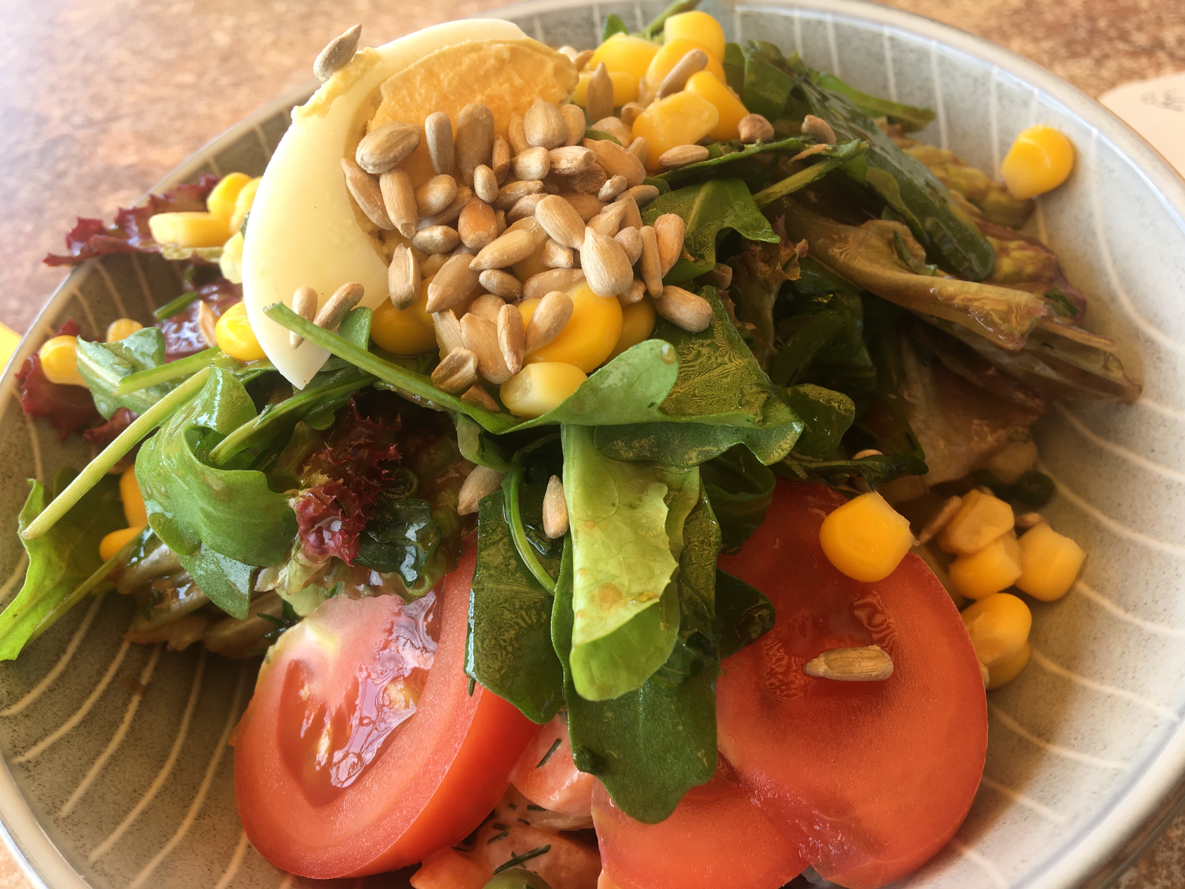 Die Küche im Haus Sonnenberg weiß uns wieder zu begeistern. Vogelsberger Kartoffelbratwurst ist der Renner, die Möhren-Kokus-Suppe mit Kerbel findet begeisterte Abnehmer und wer sich für das Vulkanschnitzel entscheidet, bekommt noch einen leckeren Beilagensalat dazu.
