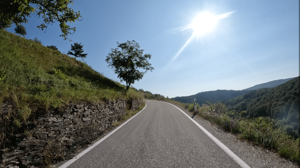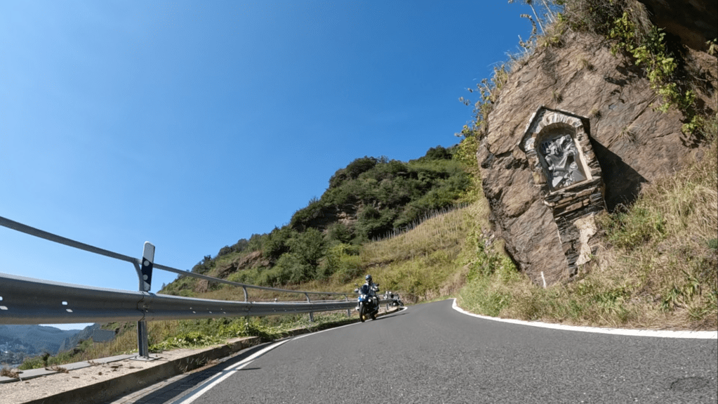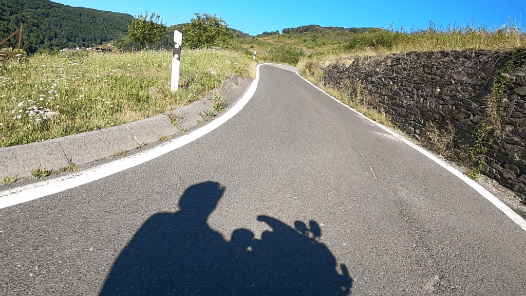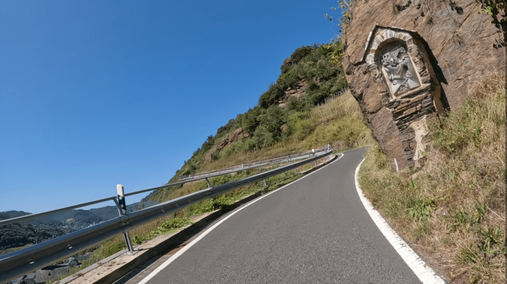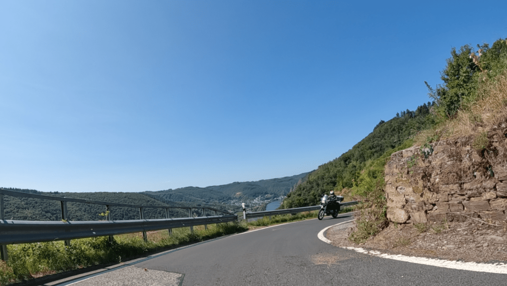 Die nächsten 75 Kilometer sind so ganz nach unserem Geschmack. Wir schlagen uns einmal quer über den Hunsück Richtung Zell an der Mosel, um dann in vielen Schleifen, die uns in endlosen Kurven und Kehren durch zahlreiche Seitentäler führen, Valwig zu erreichen. Wir biegen in die Kreuzstraße ab, fahren durch den alten Ortskern und stürzen uns mit Lust in die erste Serpentine. Steil führt das schmale Asphaltband bergab; gut 300 Höhenmeter gilt es zu überwinden.