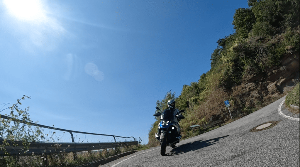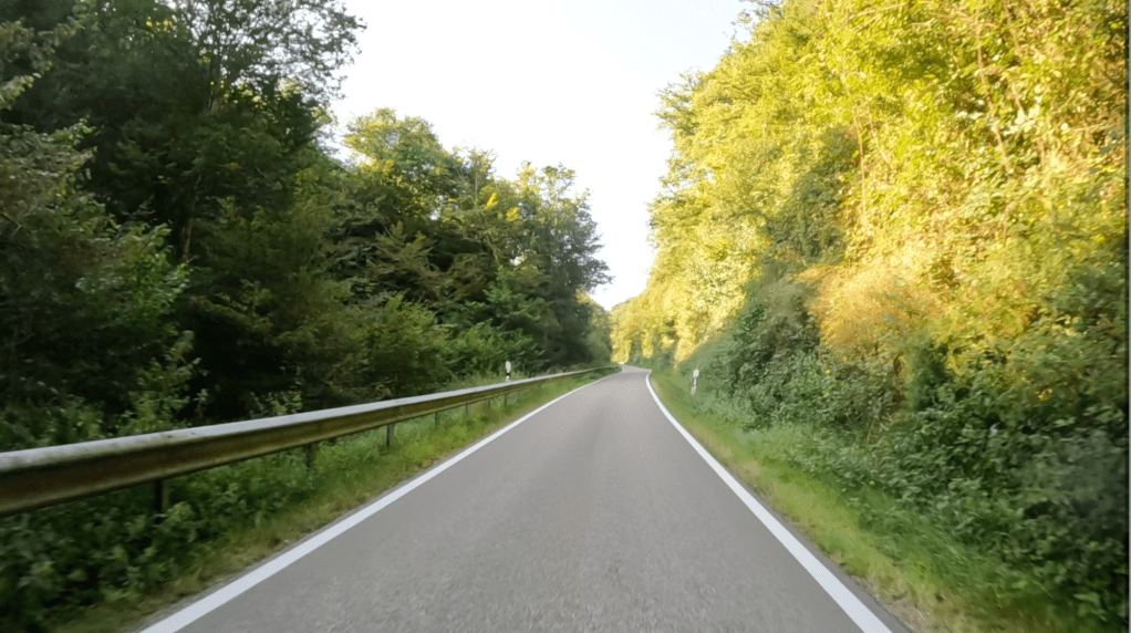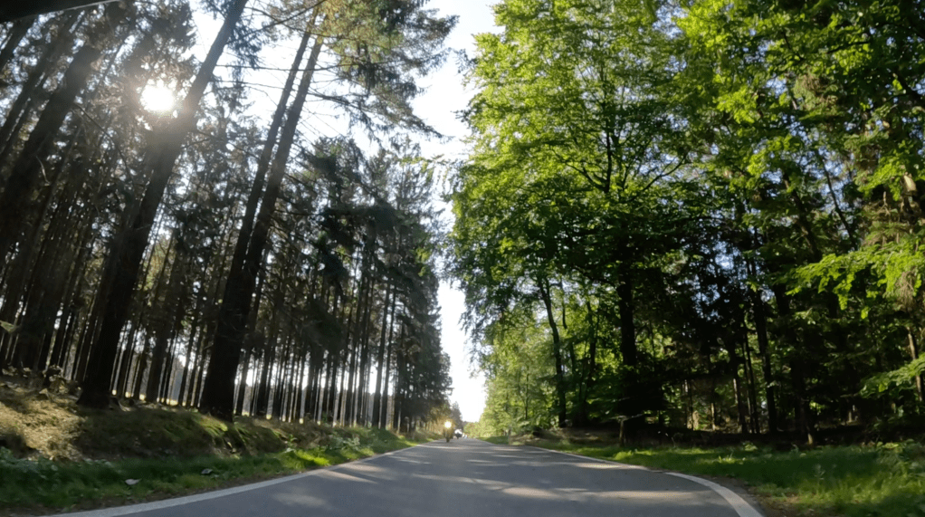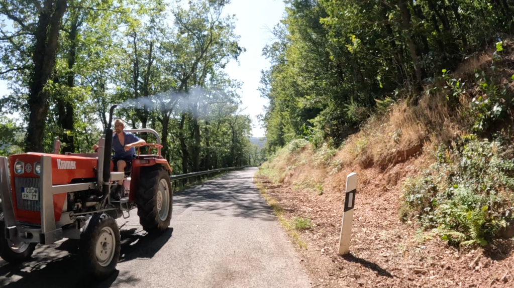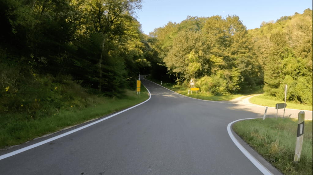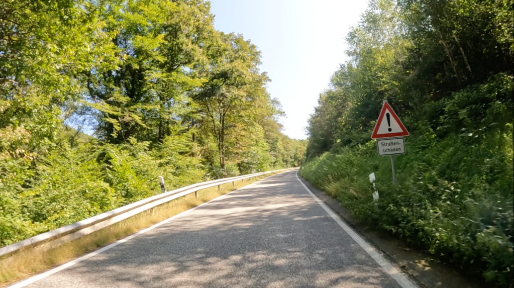 Die nächsten 75 Kilometer sind so ganz nach unserem Geschmack. Wir schlagen uns einmal quer über den Hunsück Richtung Zell an der Mosel, um dann in vielen Schleifen, die uns in endlosen Kurven und Kehren durch zahlreiche Seitentäler führen, Valwig zu erreichen. Wir biegen in die Kreuzstraße ab, fahren durch den alten Ortskern und stürzen uns mit Lust in die erste Serpentine. Steil führt das schmale Asphaltband bergab; gut 300 Höhenmeter gilt es zu überwinden.
