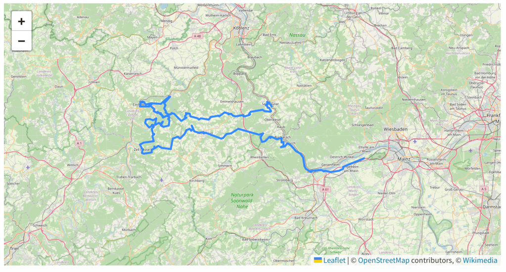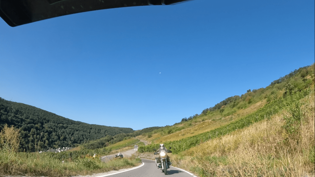 19 Motorradfahrer stehen an diesem Samstagmorgen am Treffpunkt in Heidenfahrt; 17 Teilnehmer und zwei Tourguides – so viele waren wir noch nie! Bei strahlendem Sonnenschein werfen wir uns um 9 Uhr ein kurzes Stück auf die Autobahn um dann, hinter Bingen, über die B9 am Rhein entlang zu cruisen. In Rheindiebach ist es mit der Beschaulichkeit vorbei, wir zweigen auf die Rheingoldstraße ab und nehmen hinter Manubach die ersten engen, herausfordernden Serpentinen unter die Räder, die uns mitten durch die Weinberge führen.