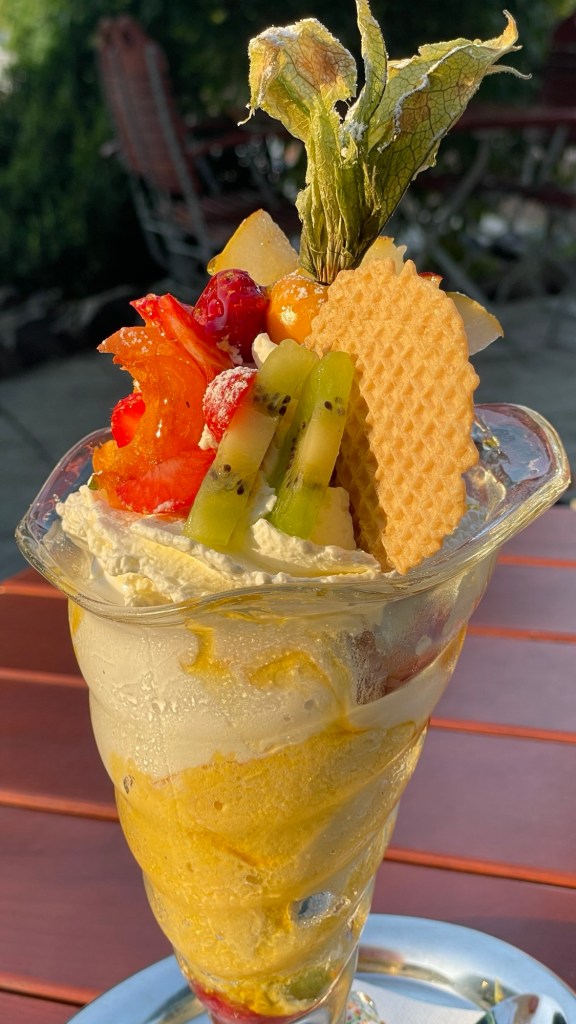 Eine Handvoll Straßen gibt es hier, buntes Fachwerk, ein altes Backes, Blumenwiesen. Der Sänger Thomas Anders wurde in Mörz am 1. März 1963 geboren, weiß zumindest Google. 200 freundliche Einwohner leben heute hier. Eine davon ist Kati, die uns in ihrem Hotel „Zum Mühlental“ herzlich bewirtet.Wir sitzen auf der Terrasse im Schatten und genießen die kurze Auszeit.